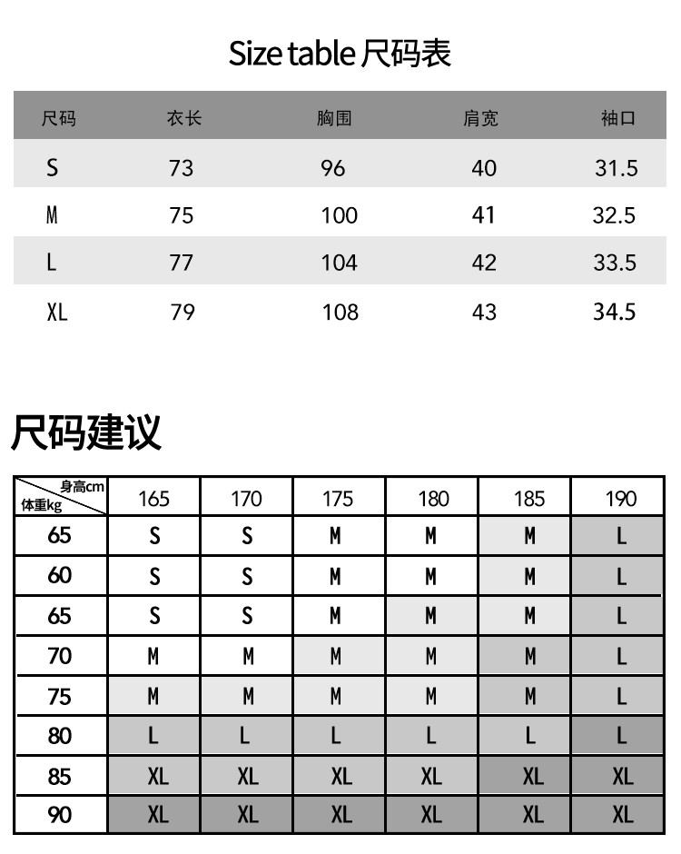 China (cm) 165 / 88-90 170 / 96-98 175 / 108-110 180 / 118-122 185 / 126-130