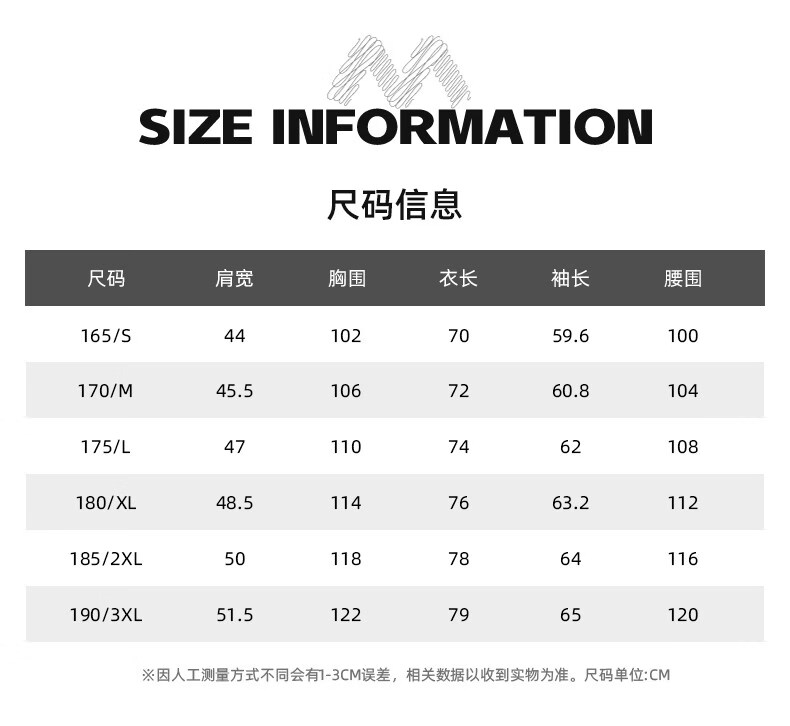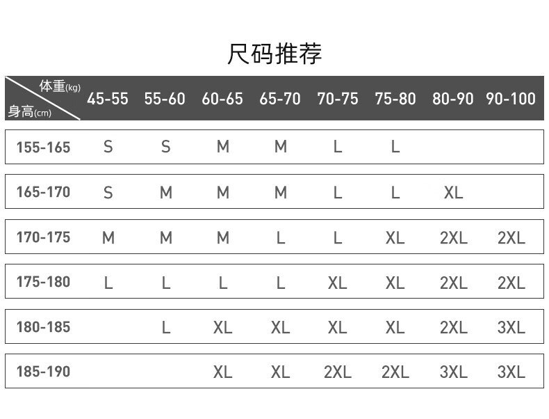 China (cm) 165 / 88-90 170 / 96-98 175 / 108-110 180 / 118-122 185 / 126-130