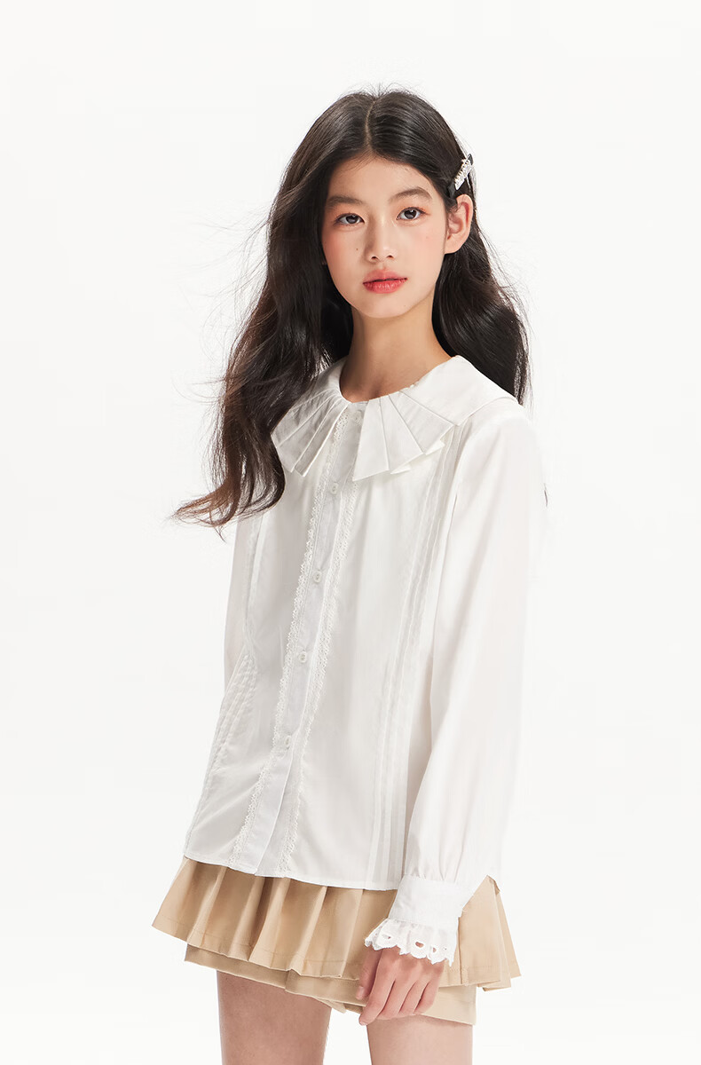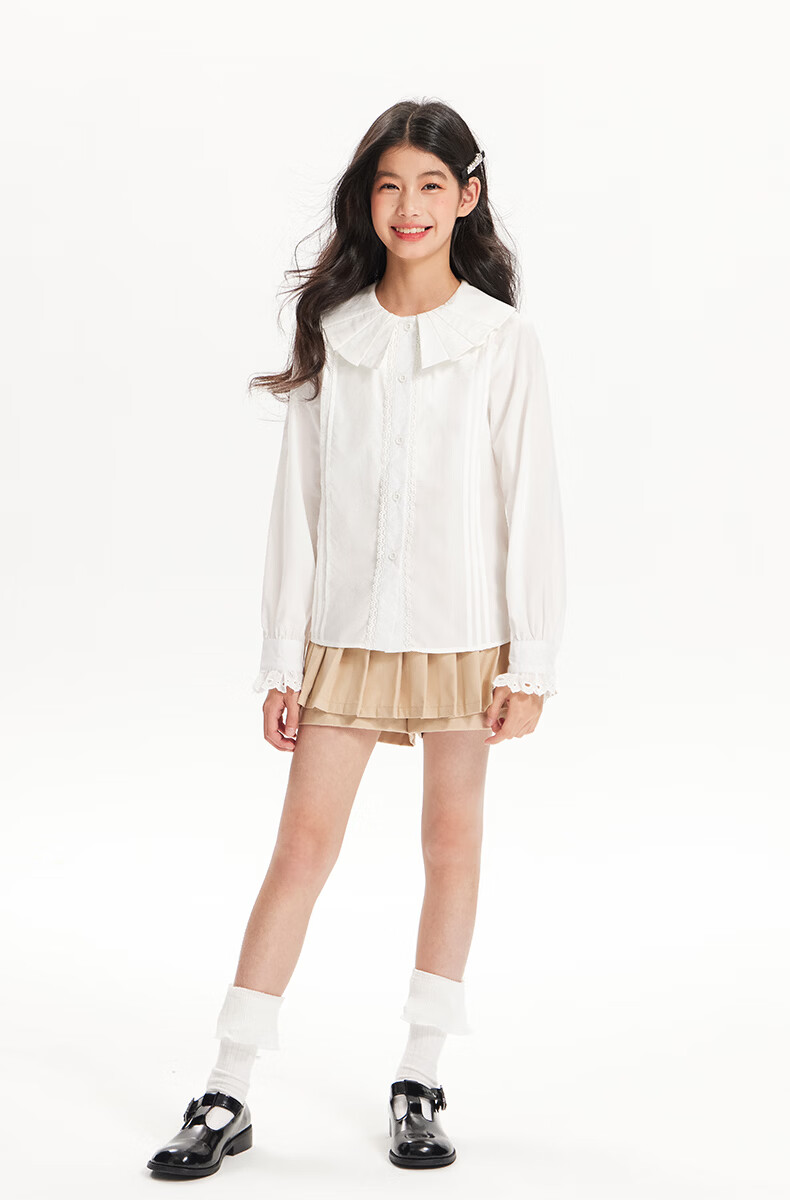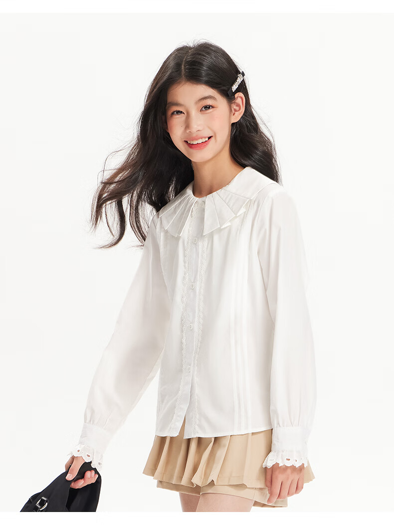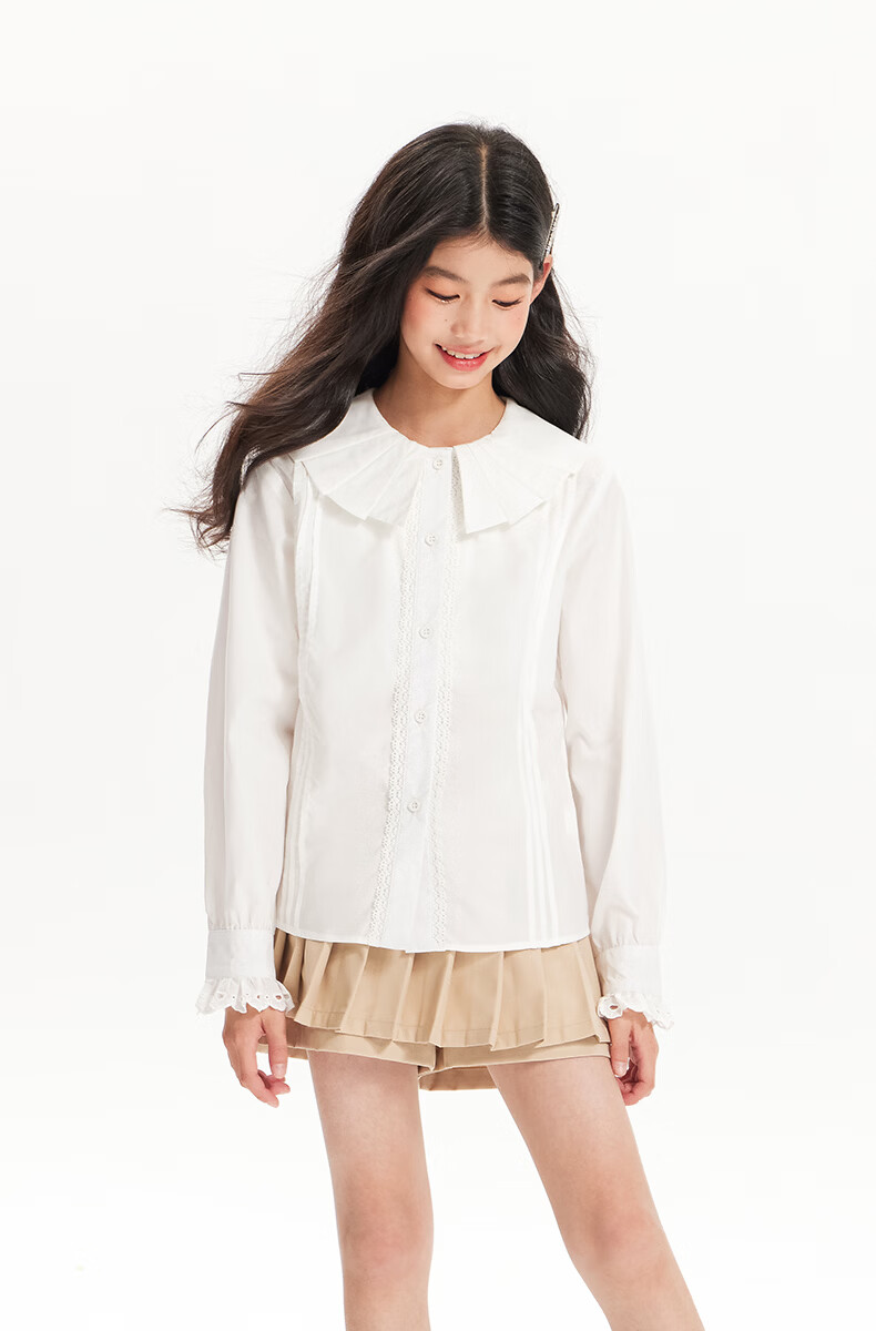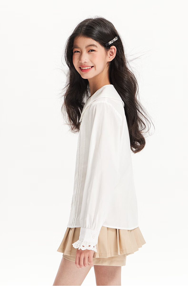 BARRY BANNY Girls' Tencel Lyocell Shirt 2026 Spring Doll Collar Top Loose Cardigan CX506 White 160