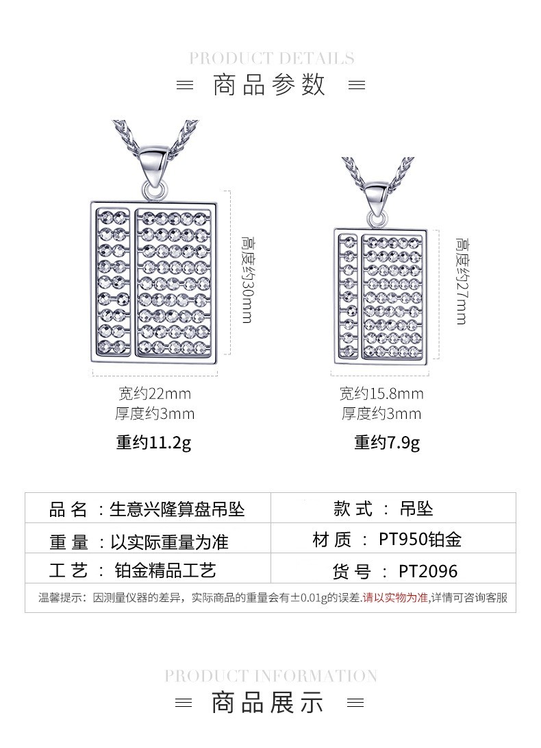 Jintiandi Jewelry Platinum Pendant PT950 Wishful Abacus Pendant Men's and Women's Wealth-Making Platinum Abacus Necklace 11.35g Supports inspection. If you get a fake one, you will lose three.