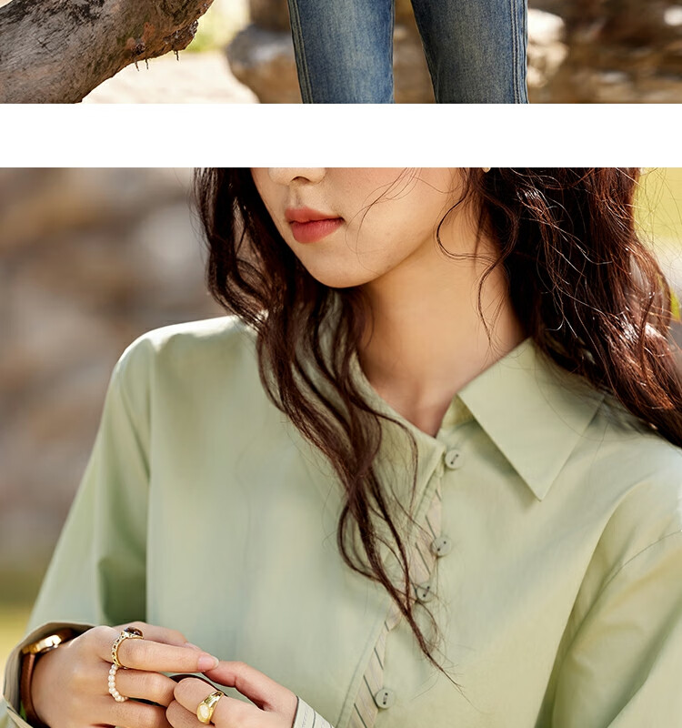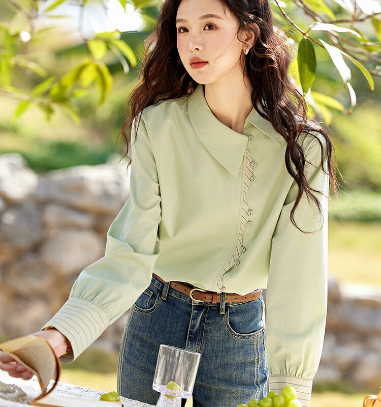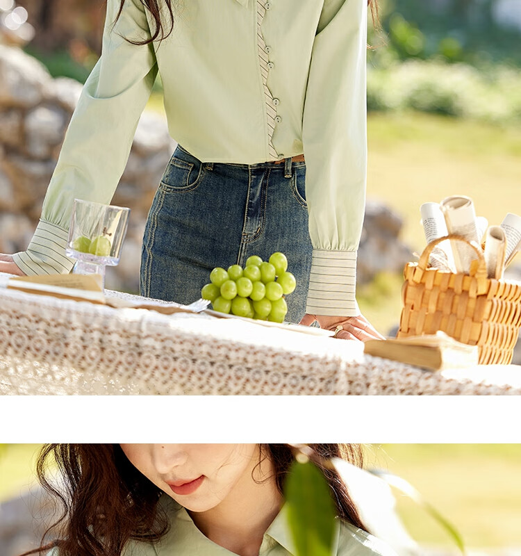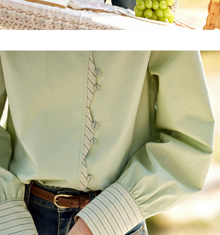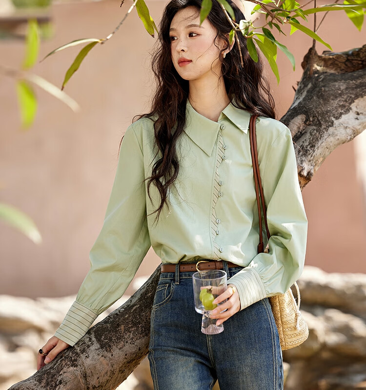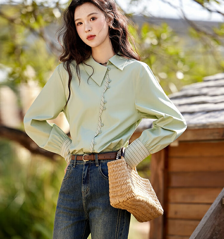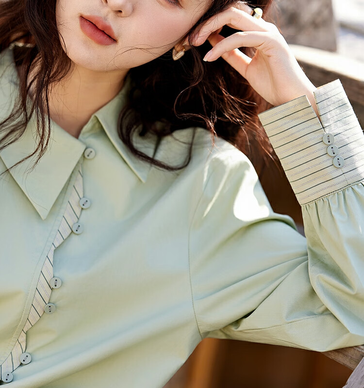 Mystery Show Reassuring Quality Tencel Cotton Striped Splicing Green Shirt 2026 Spring High-Quality Small Shirt for Women