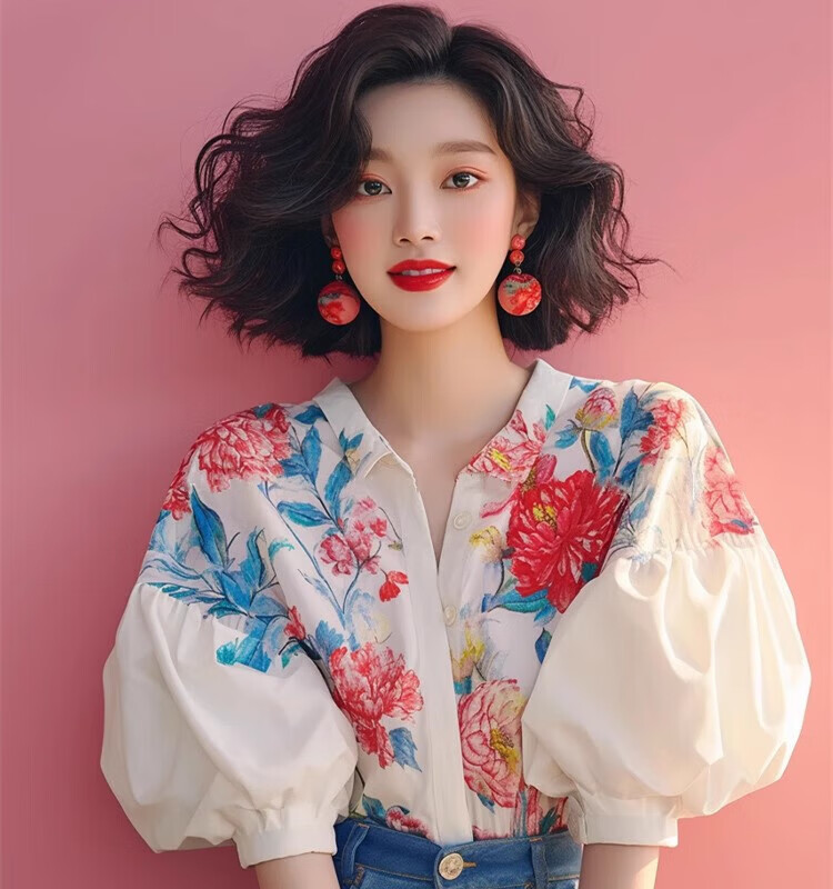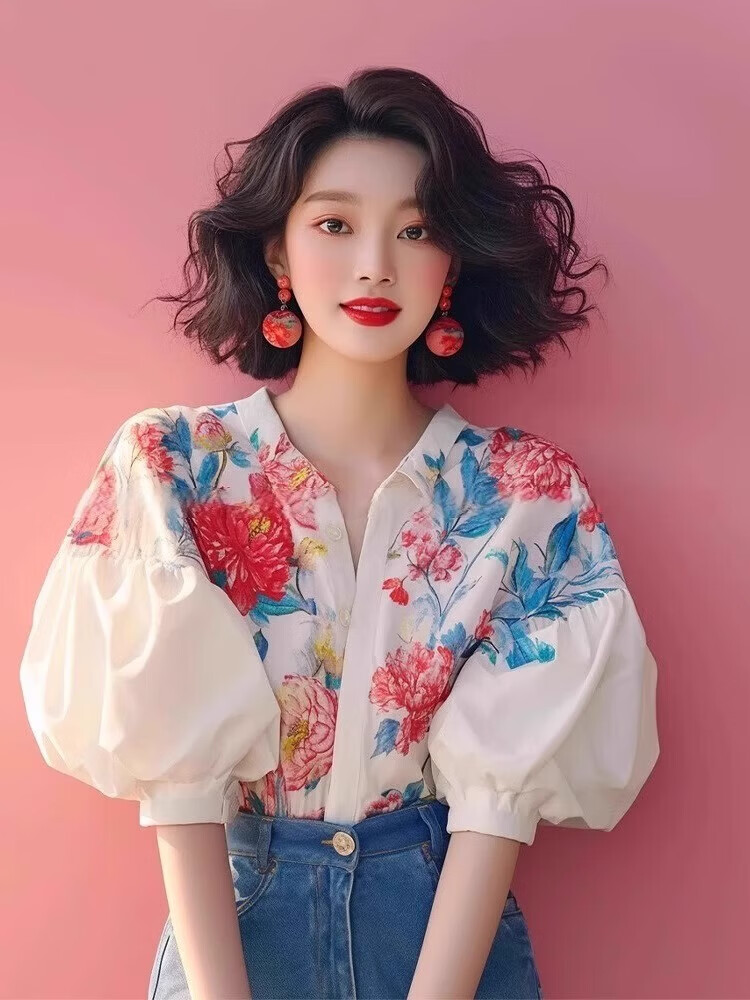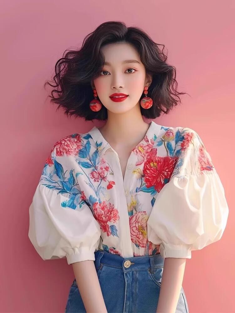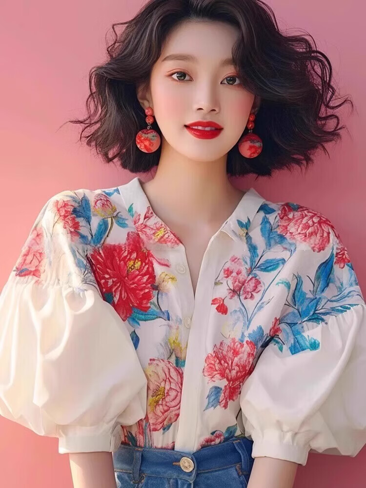 Lao Tangsen Jingdong Direct Purchase French Puff Sleeve Floral Short Sleeve Shirt Women's 26 New Shirt Women's L