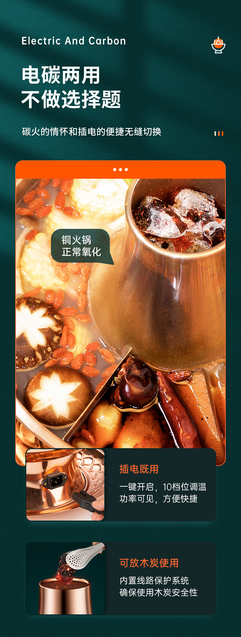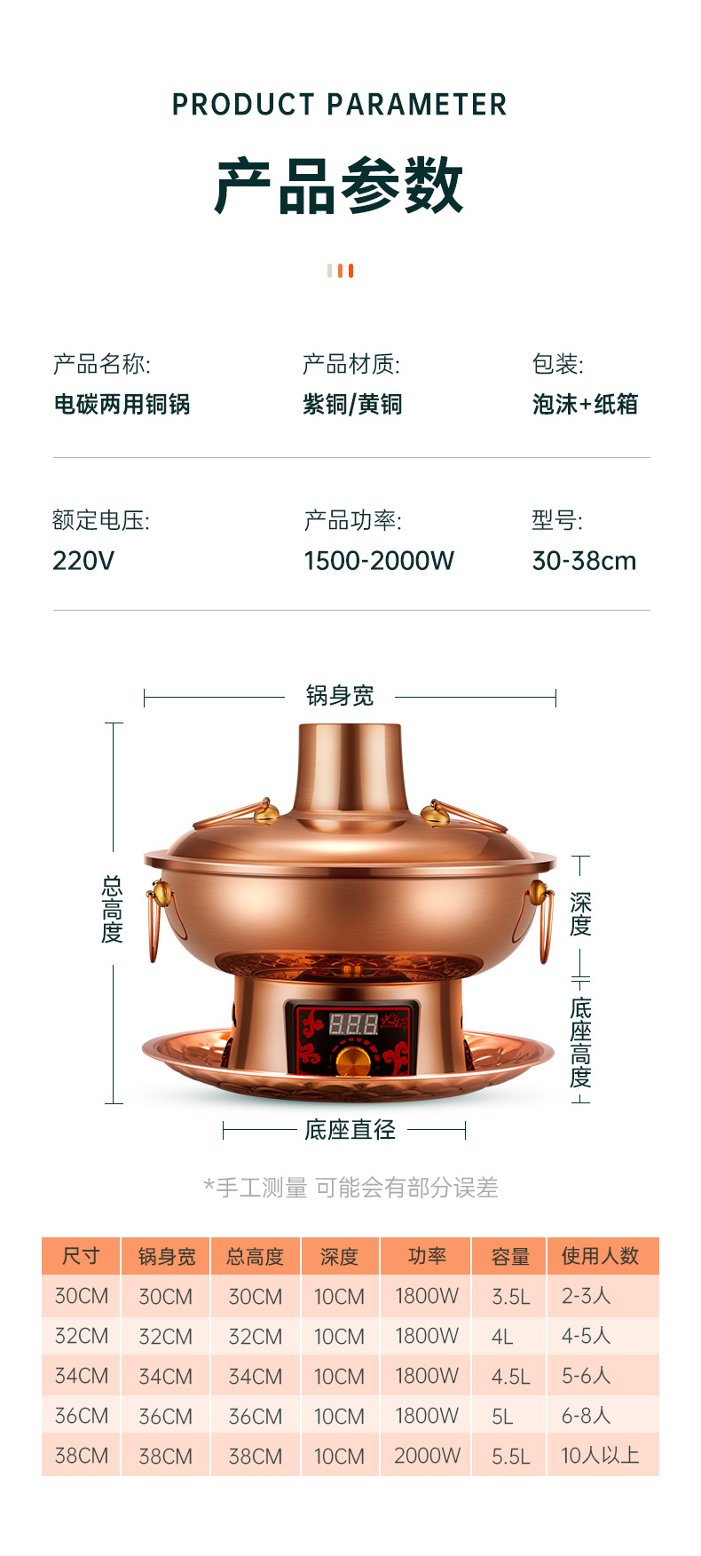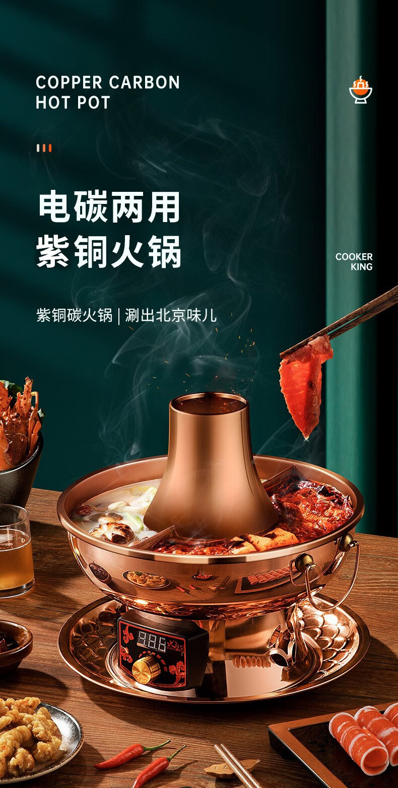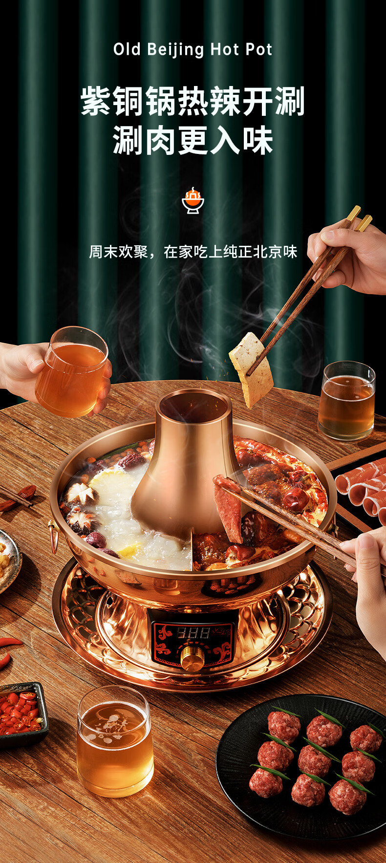 Chuilaoye (CHUILAOYE) copper hot pot, electric and carbon dual-purpose mandarin duck pot, pure copper pot, hot pot pot, charcoal, household plug-in, old Beijing shabu-shabu, Yuanyang 4-6 people, CNC 10 gears, 32cm