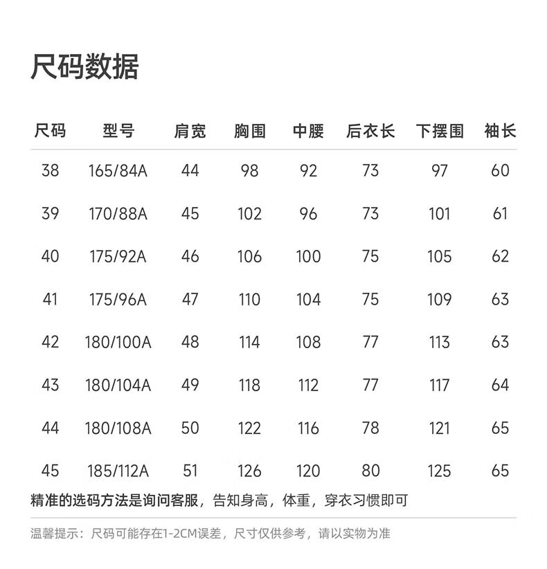 China (cm) 160-165/84-86 165-170 / 88-90 167-172 / 92-96 168-173 / 98-102 170-176 / 106-110