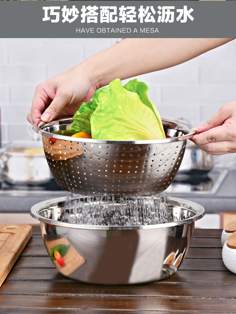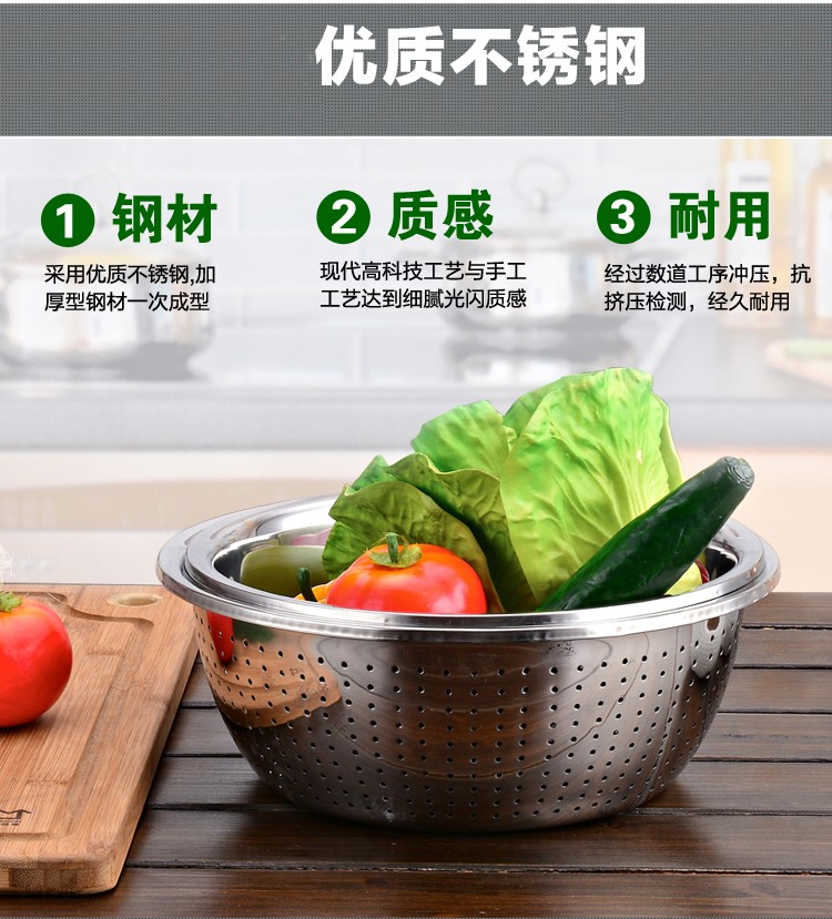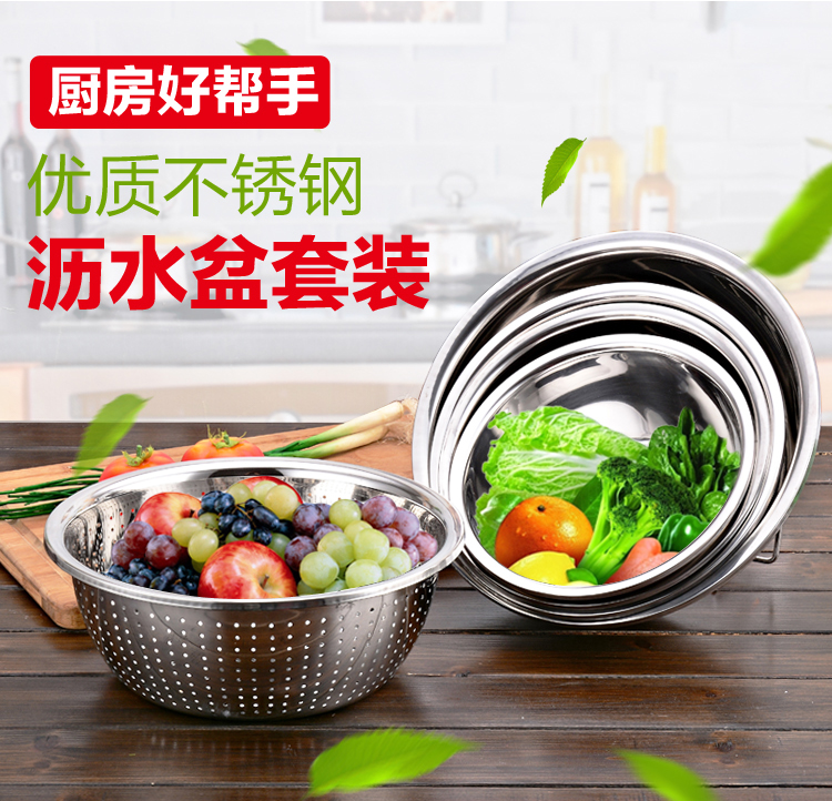 Yongcai five-piece set stainless steel thickened vegetable basin leaky basin vegetable basin rice washing basin round basin five-piece set (4 solid basins + 1 leaky basin) large size 22-24-26-28-30