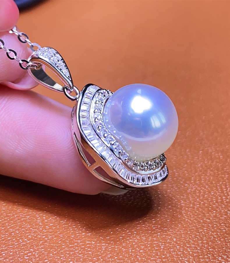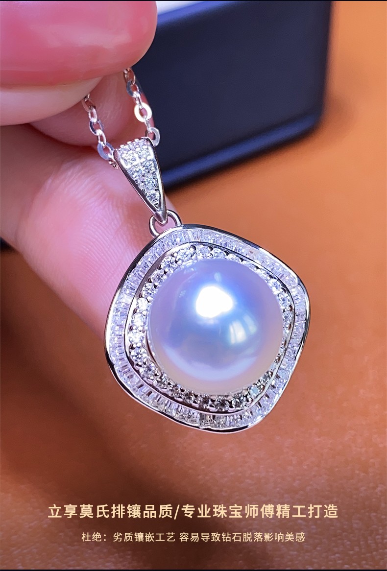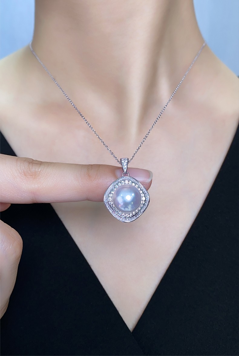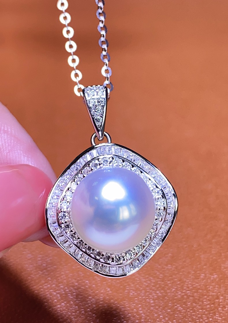 Moh's South Sea white pearl necklace, natural Australian white, round, flawless seawater pearl pendant, 18K gold inlaid with diamonds, diamond-shaped pearl pendant for girlfriend, wife, elders, white pearl pendant 12-13mm