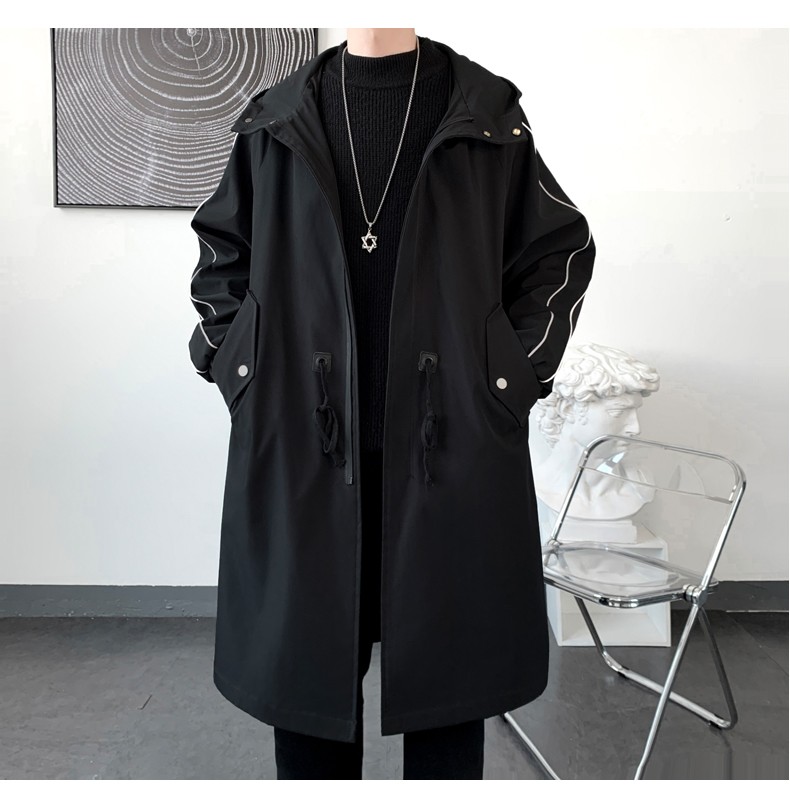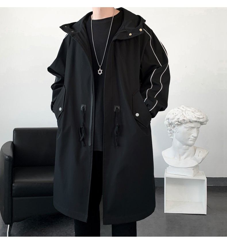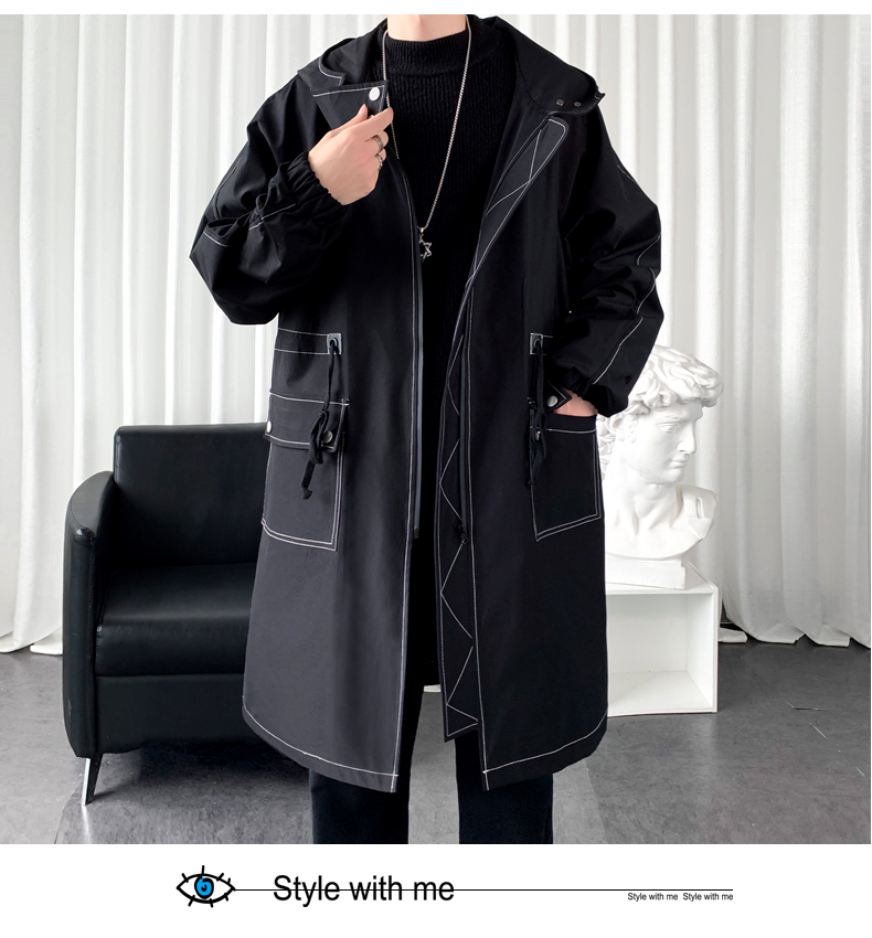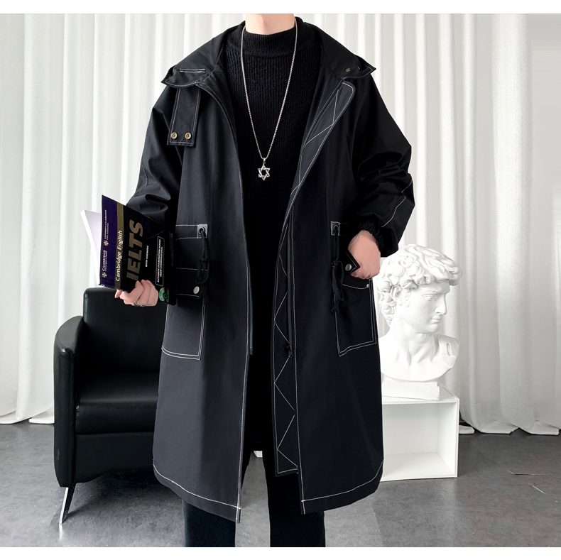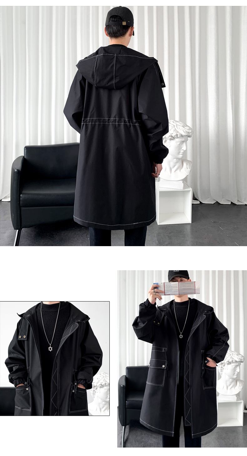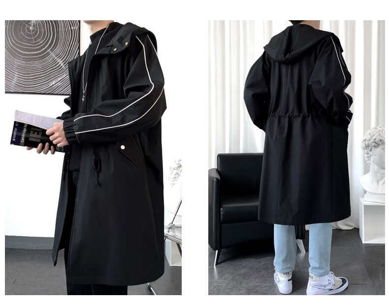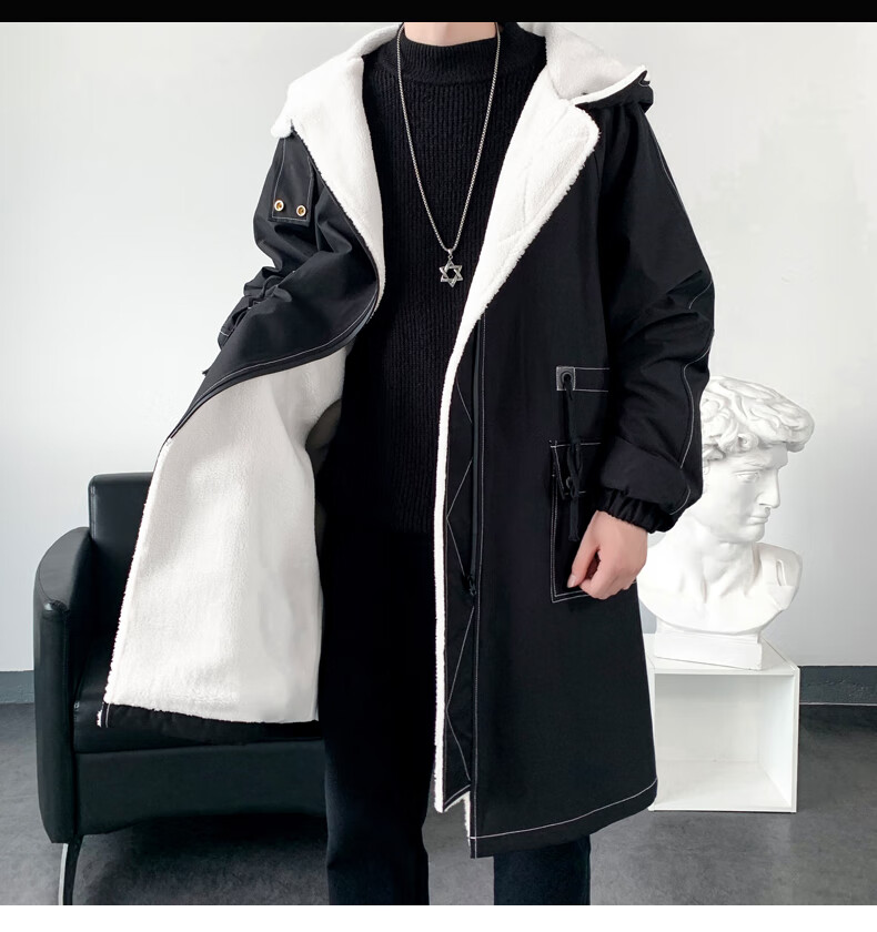 LOFVRANG (Fleet and Thickening Optional) Mid-Length Windbreaker Men's Coat Loose Trendy Brand Large Size Handsome Teenage Jacket Men Black Velvet Thickening 2XL (Suitable for 160-175 Jin Jin is equal to 0.5 kg)