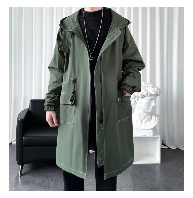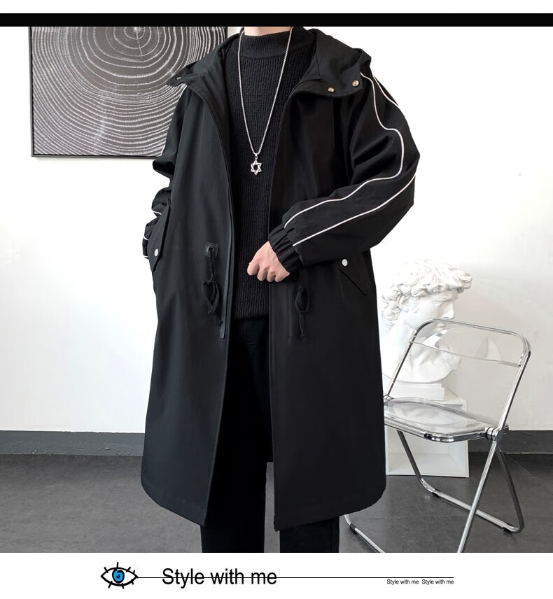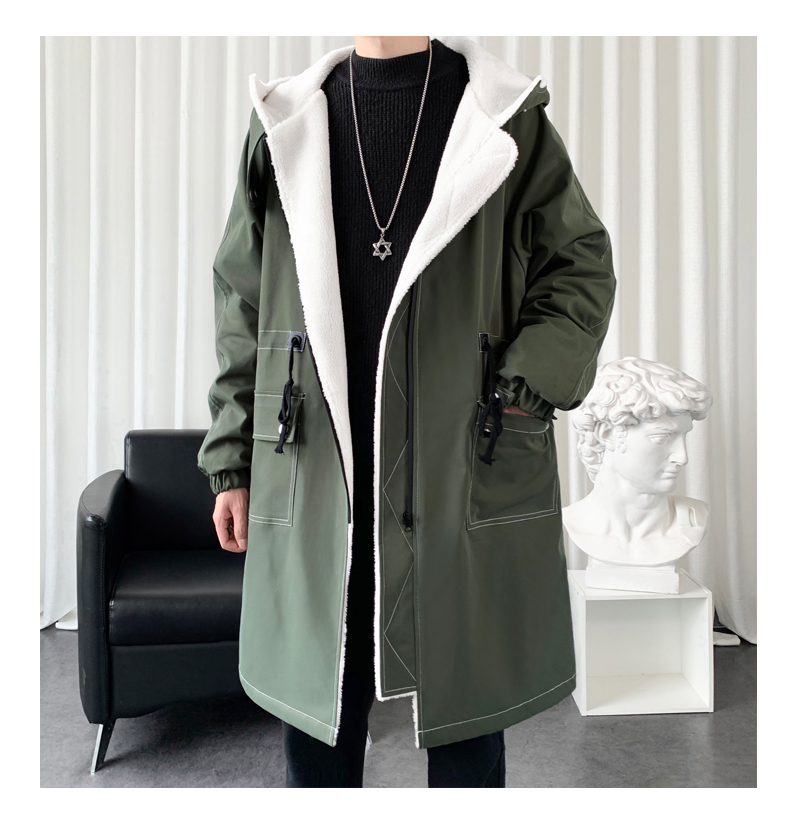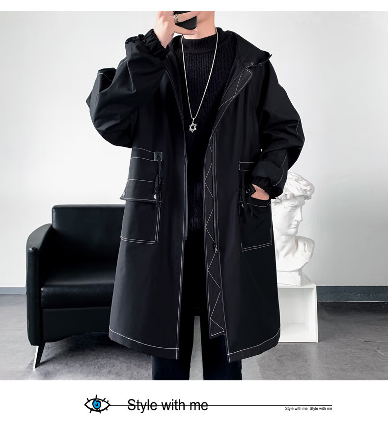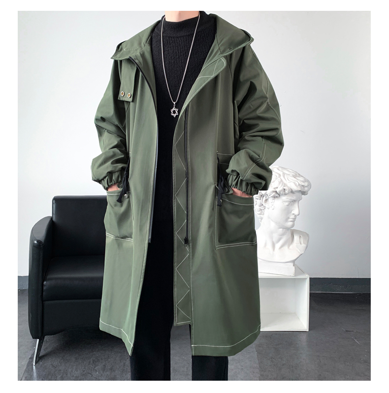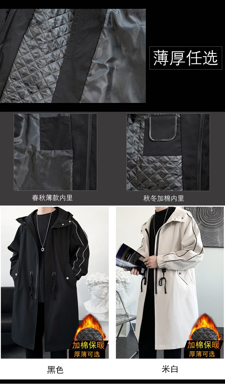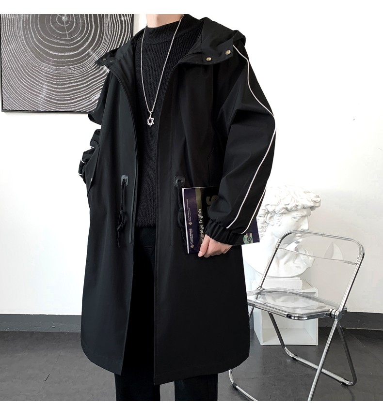 LOFVRANG (Fleet and Thickening Optional) Mid-Length Windbreaker Men's Coat Loose Trendy Brand Large Size Handsome Teenage Jacket Men Black Velvet Thickening 2XL (Suitable for 160-175 Jin Jin is equal to 0.5 kg)