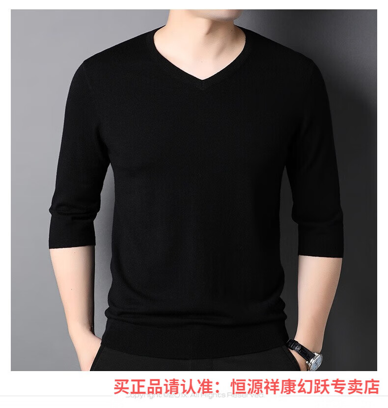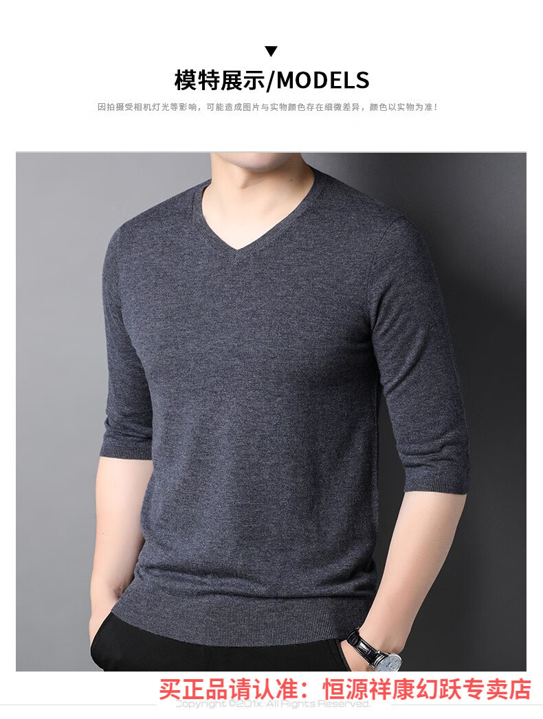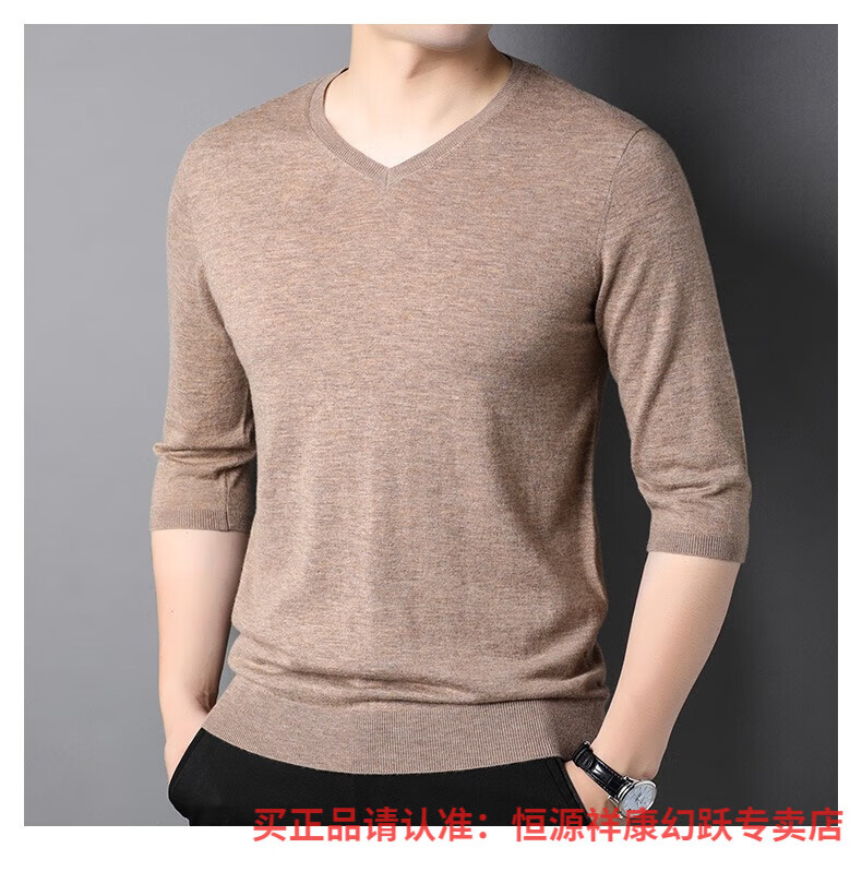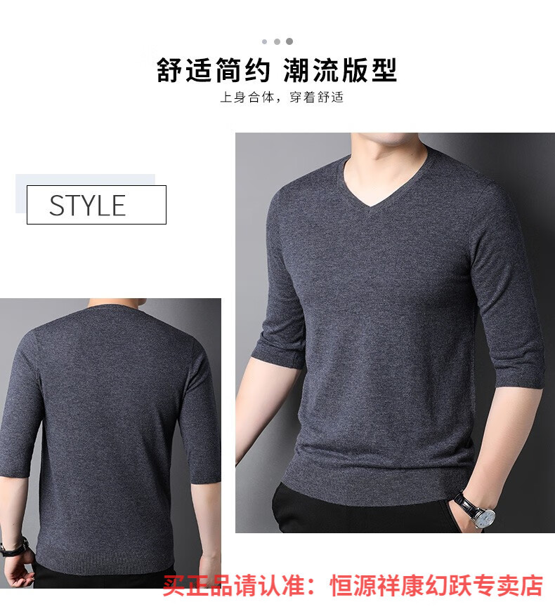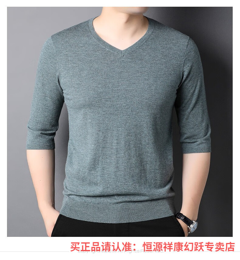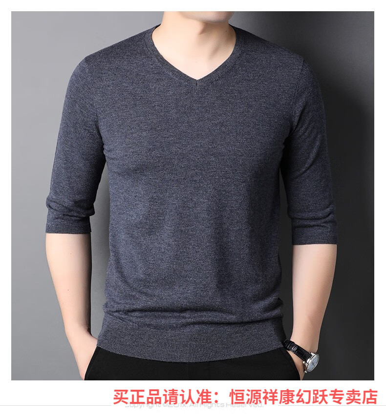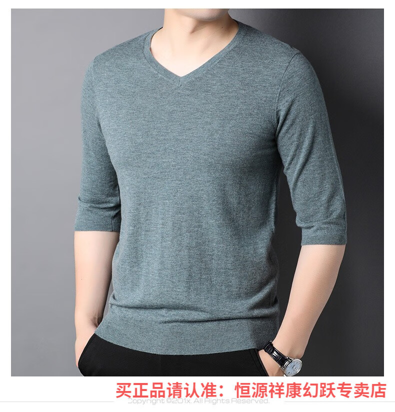 Hengyuanxiang pure wool sweater men's autumn v-neck solid color three-quarter sleeve sweater spring and autumn 100% wool thin knitted sweater medium gray L (175)