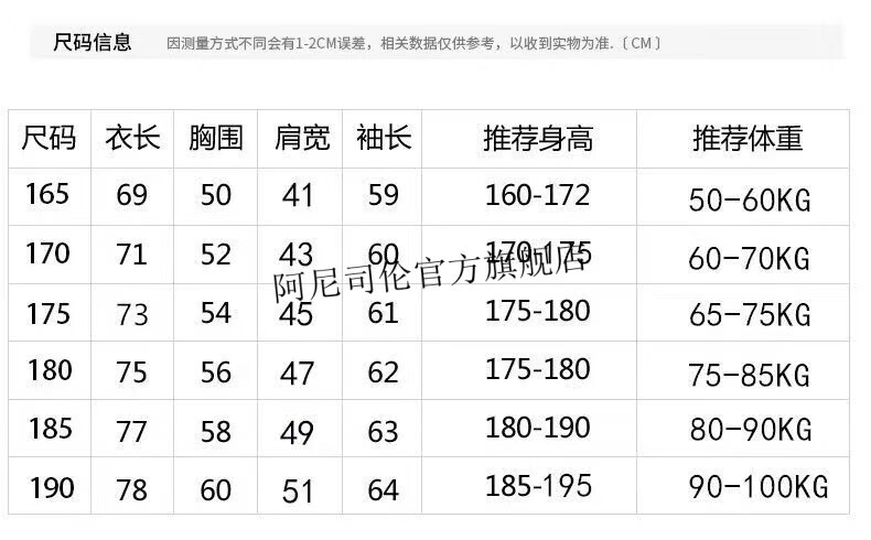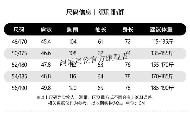 China (cm) 165 / 88-90 170 / 96-98 175 / 108-110 180 / 118-122 185 / 126-130