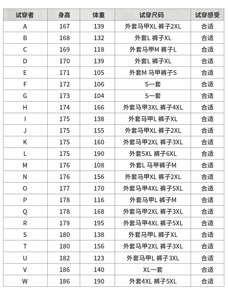 China (cm) 165 / 88-90 170 / 96-98 175 / 108-110 180 / 118-122 185 / 126-130