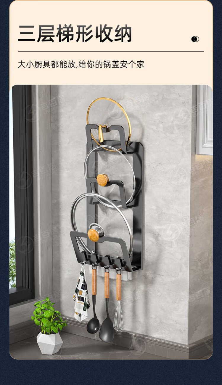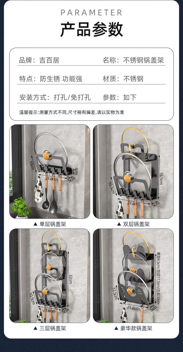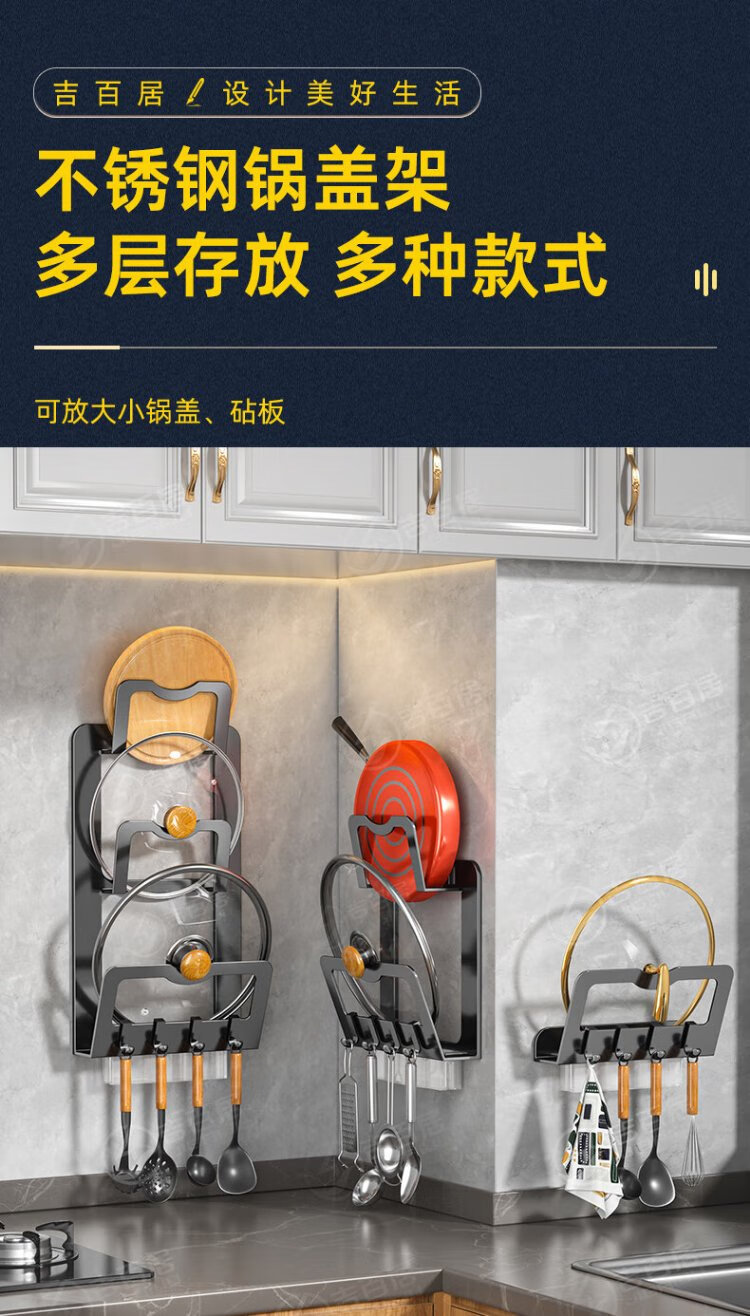 Jibaiju stainless steel pot lid rack wall hanging no punching household multi-layer chopping board rack pot lid storage rack storage kitchen storage rack standard elegant black double layer + with water tray with 4 hooks