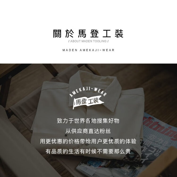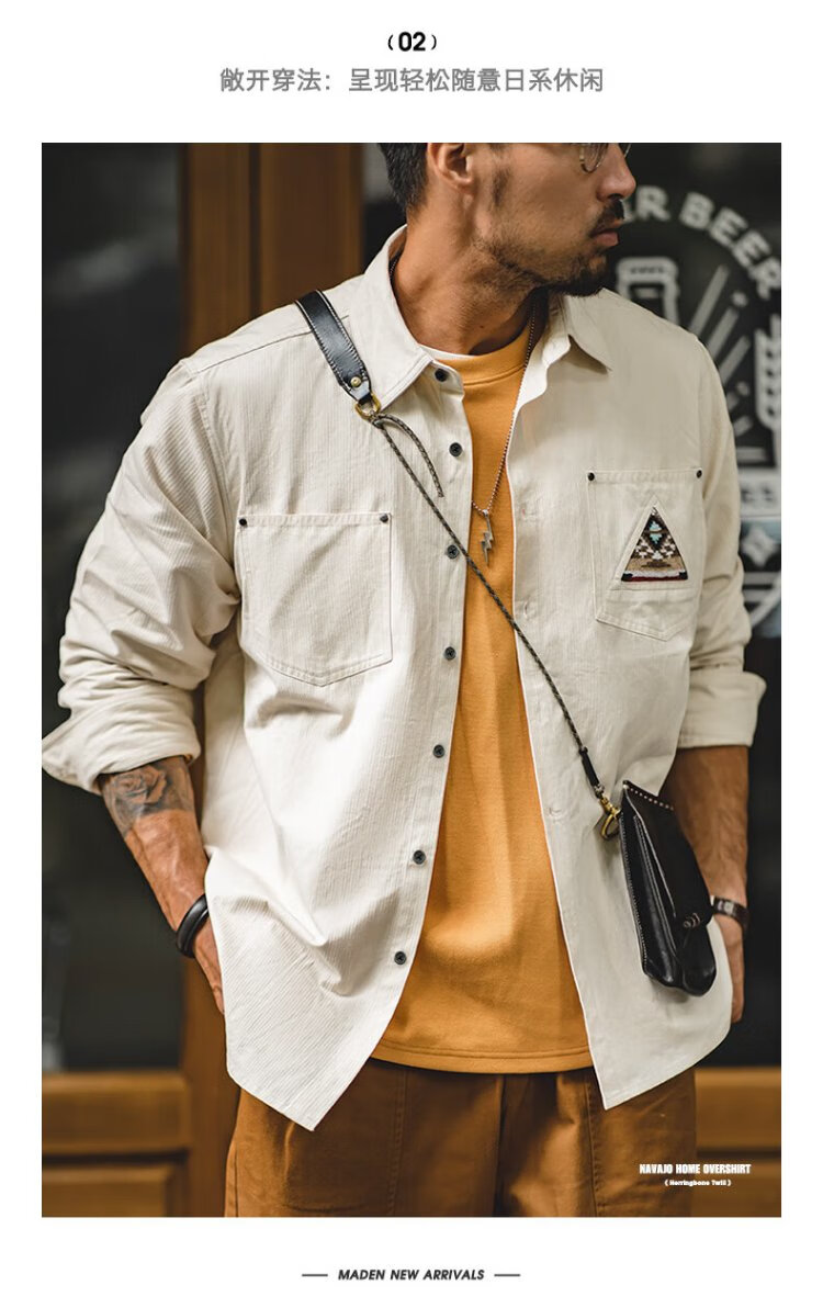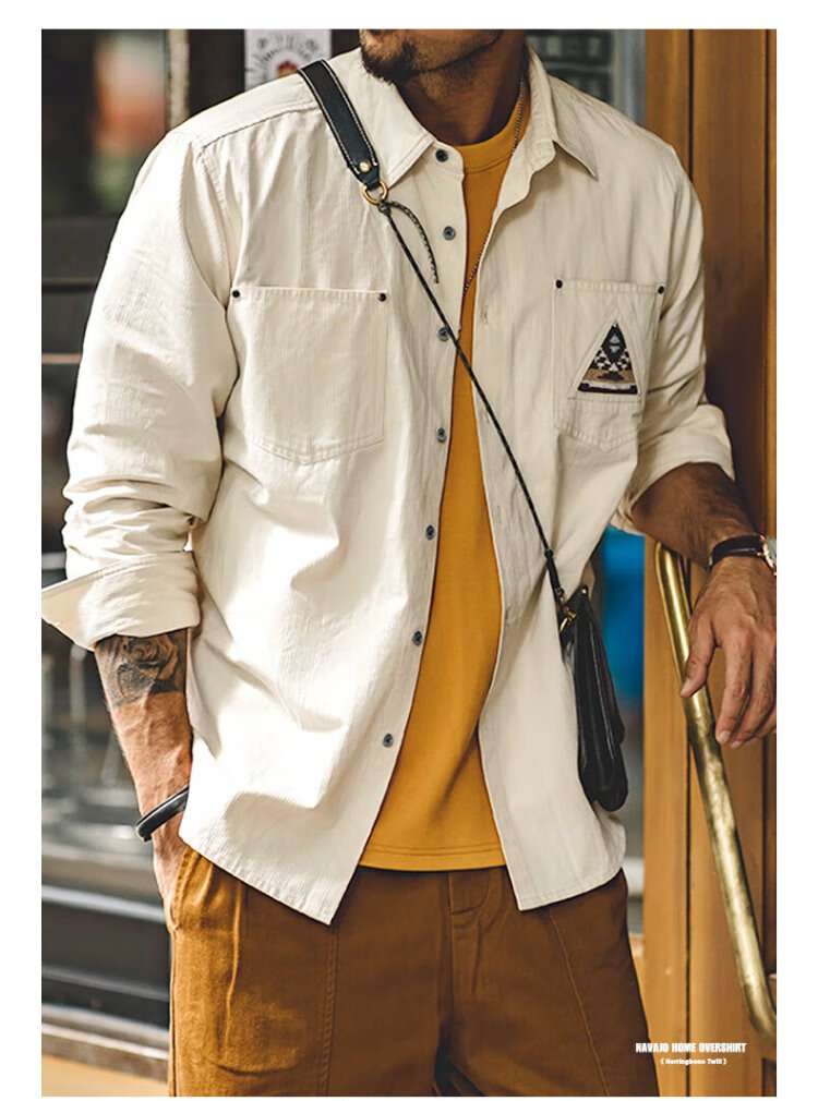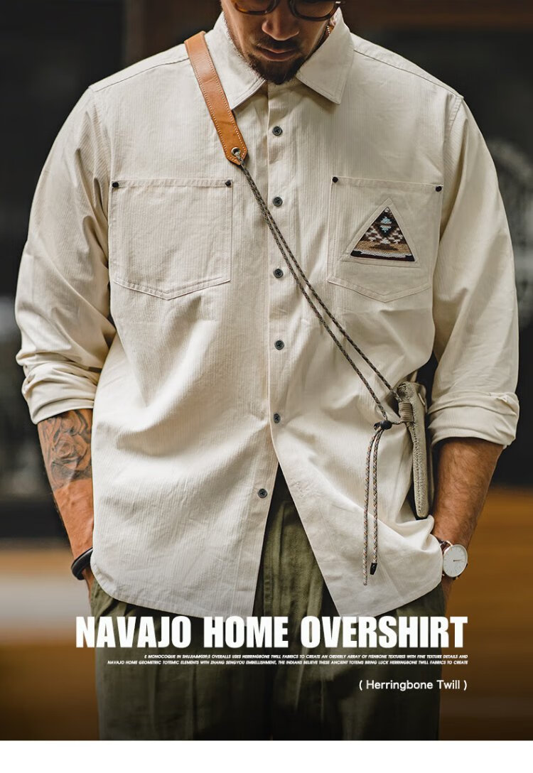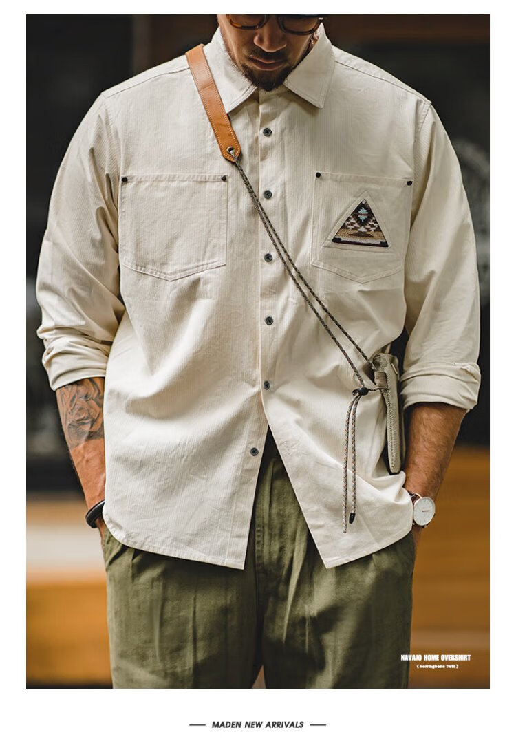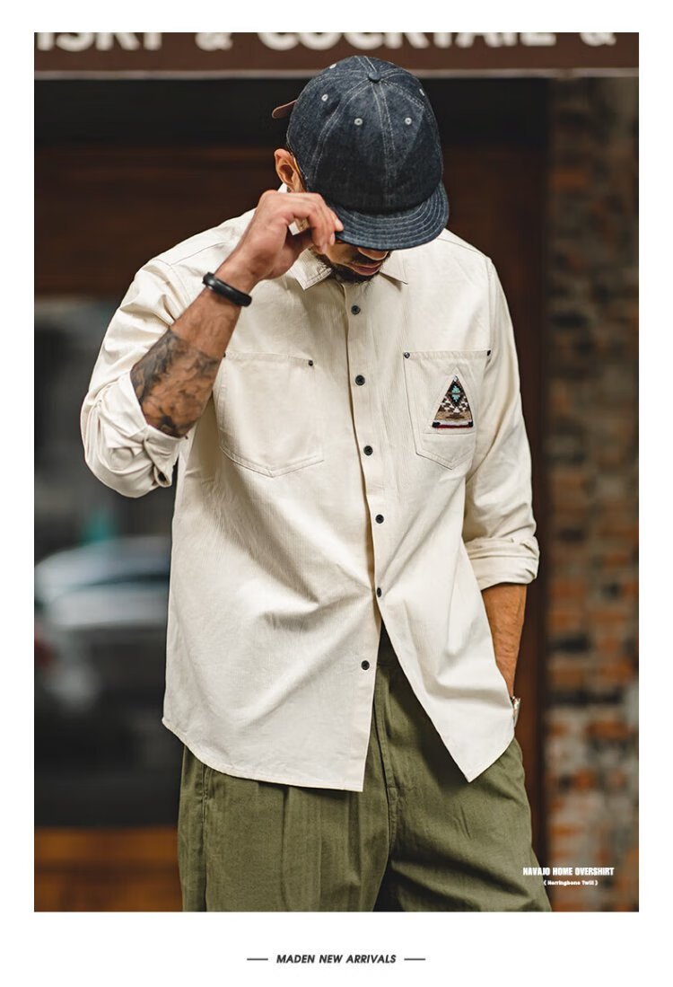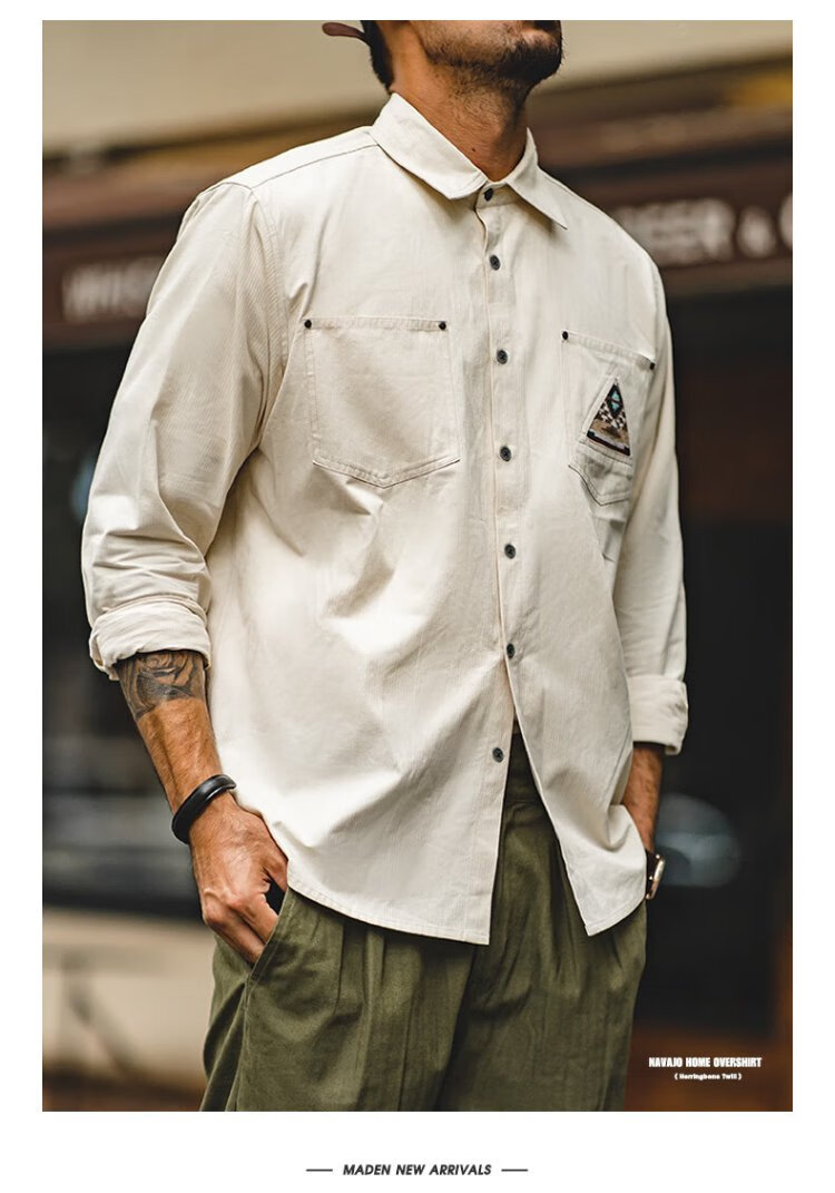 Madden workwear American retro long-sleeved shirt men's Indian totem patchwork pocket stacked cotton shirt autumn off-white L