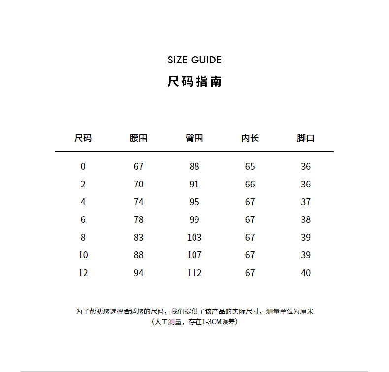 Outseam (cm) 99 cm 101.5 cm 104 cm 106.5 cm 109 cm