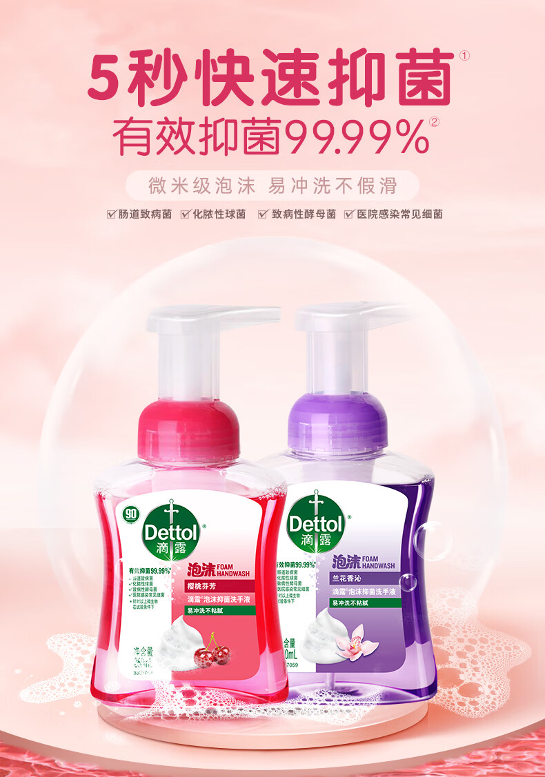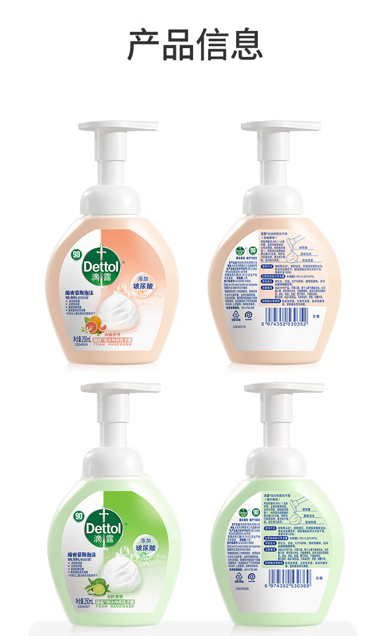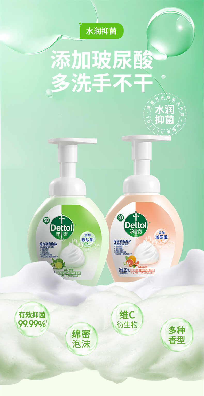 Dettol hand sanitizer, effective antibacterial 99.9%, healthy and clean hand sanitizer for children, babies and the whole family, easy to rinse, hyaluronic acid foam, grapefruit + lime 250ml*2