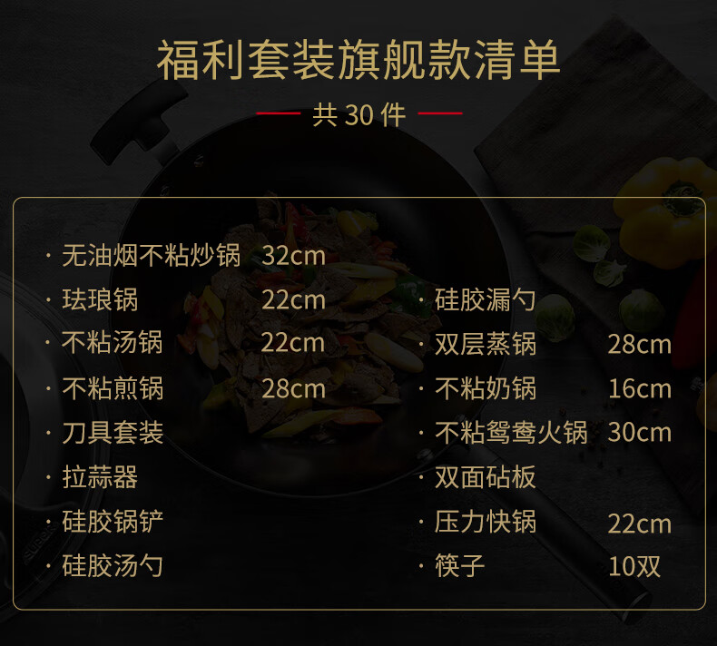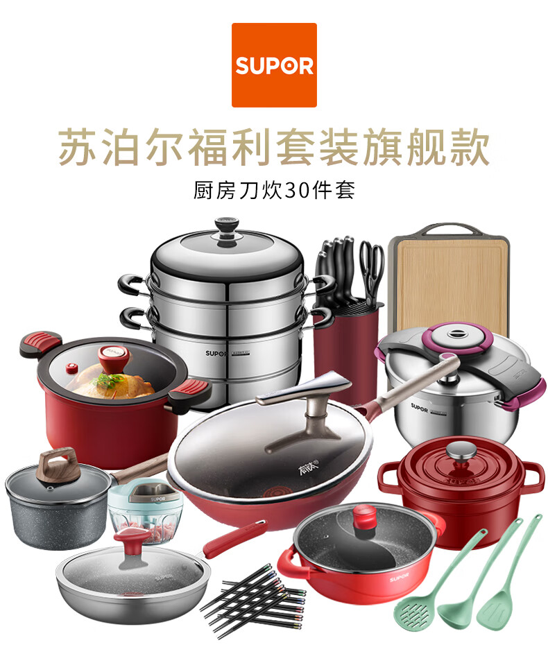 SUPOR pot set, knife, wok, frying pan, soup pot, steamer, pressure cooker, enamel pot, cast iron stew pot, kitchen utensil set, 30-piece set, 11-piece set and above