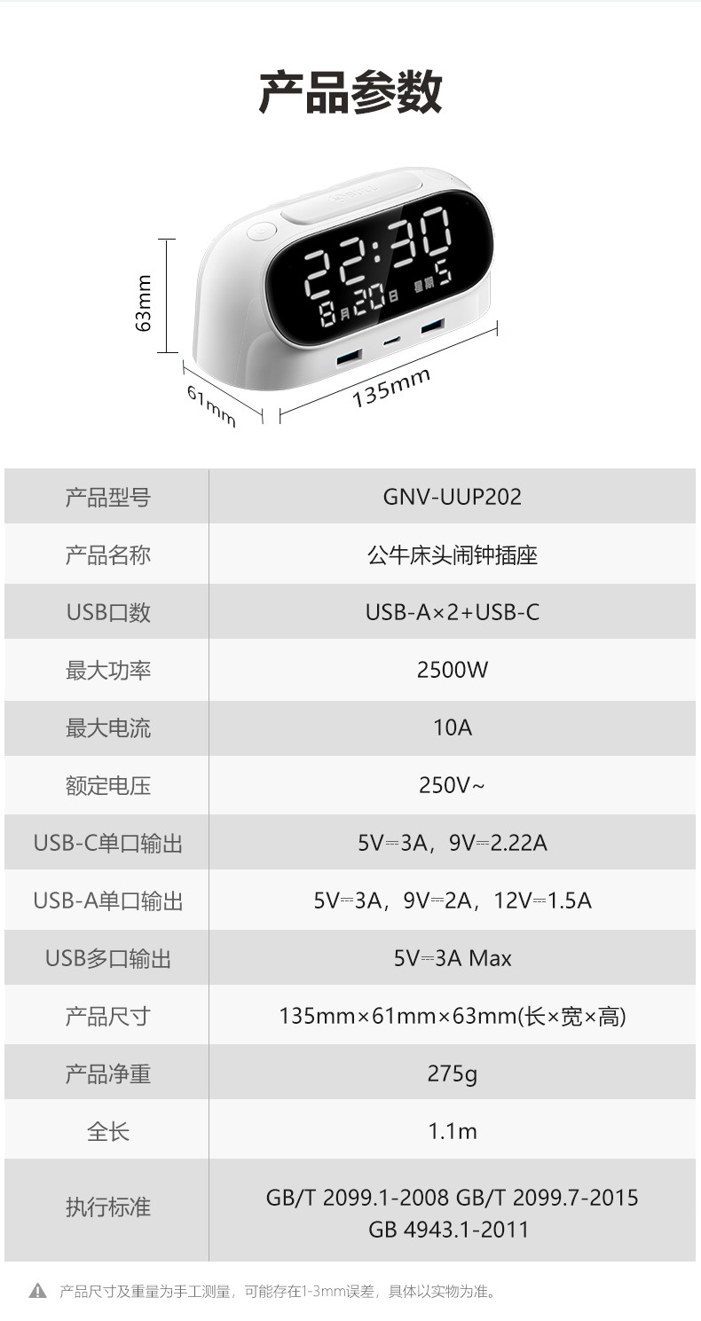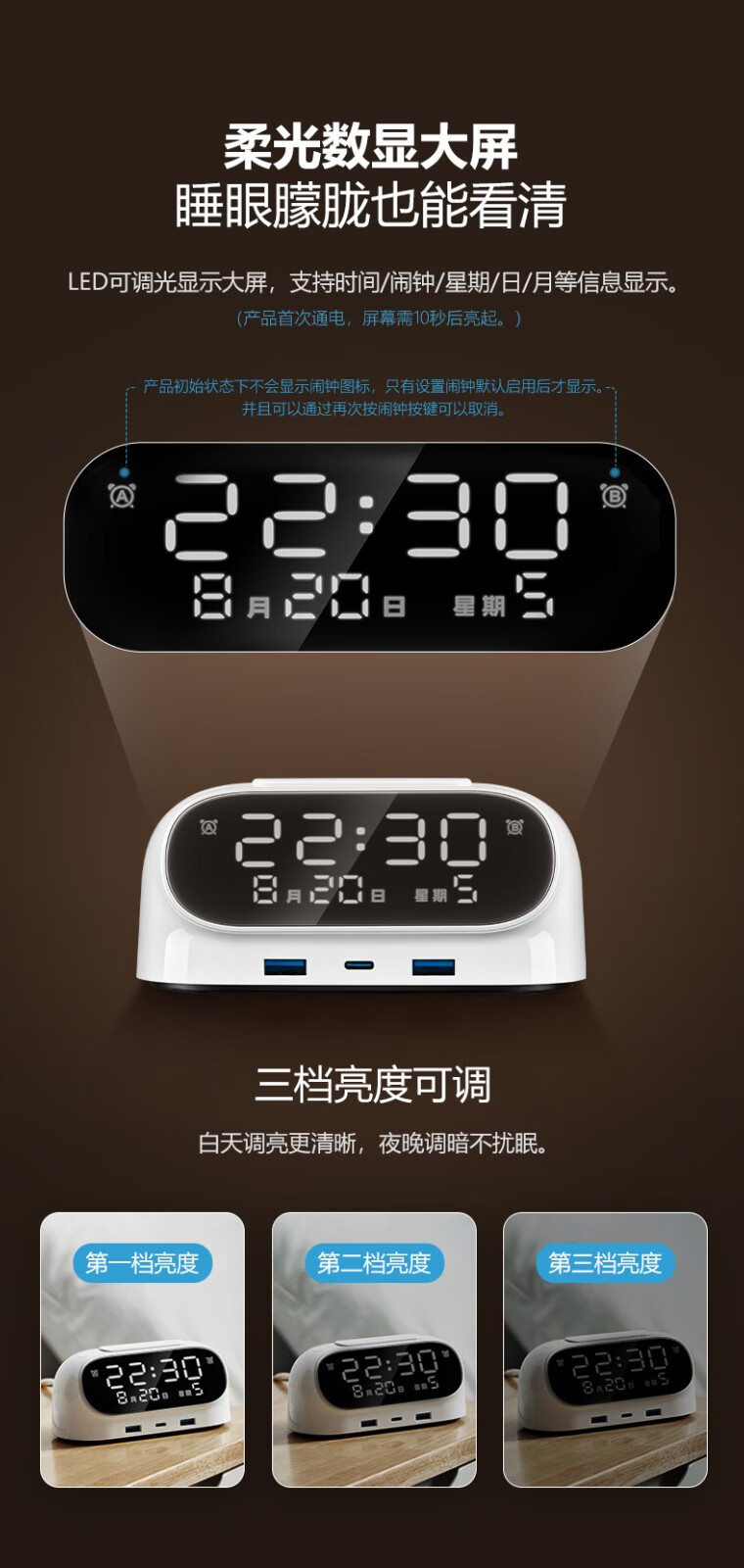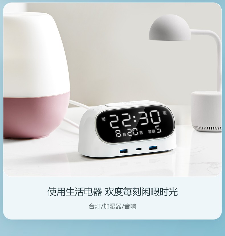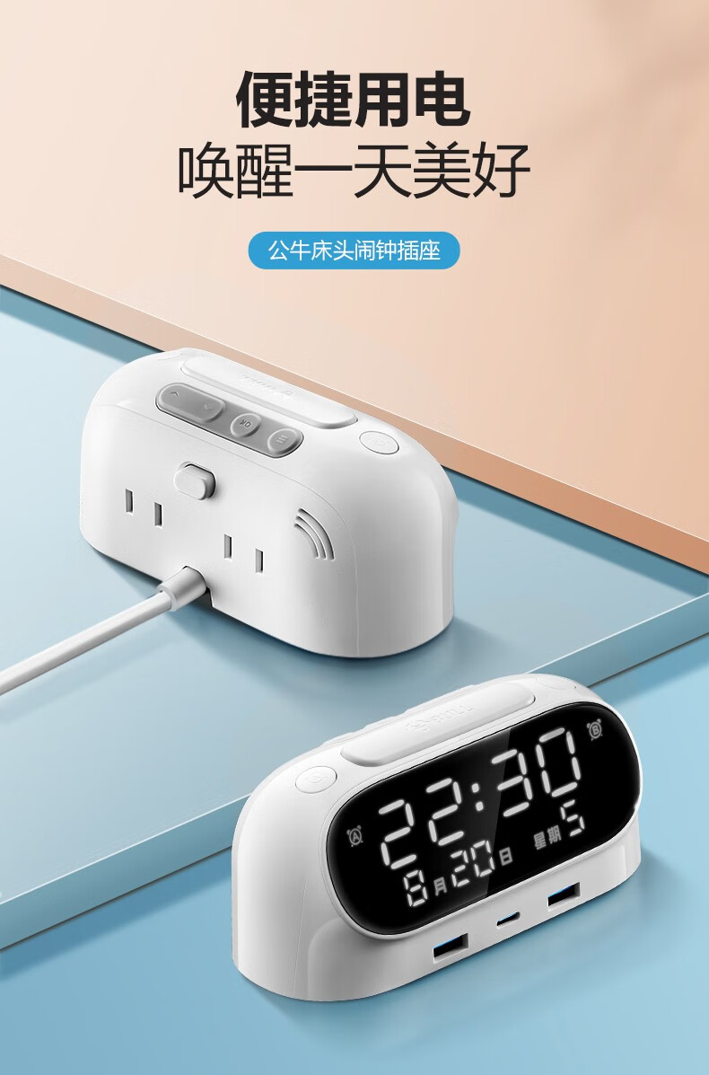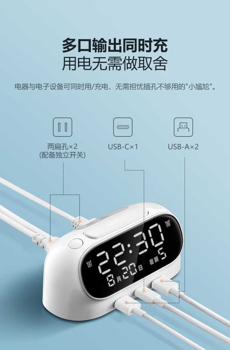 BULL second generation alarm clock charging tungsten bedside socket/plug strip/row plug/C port 20W fast charging 2 2-hole + 3 USB ports (2A 1C) total length 1.1 meters