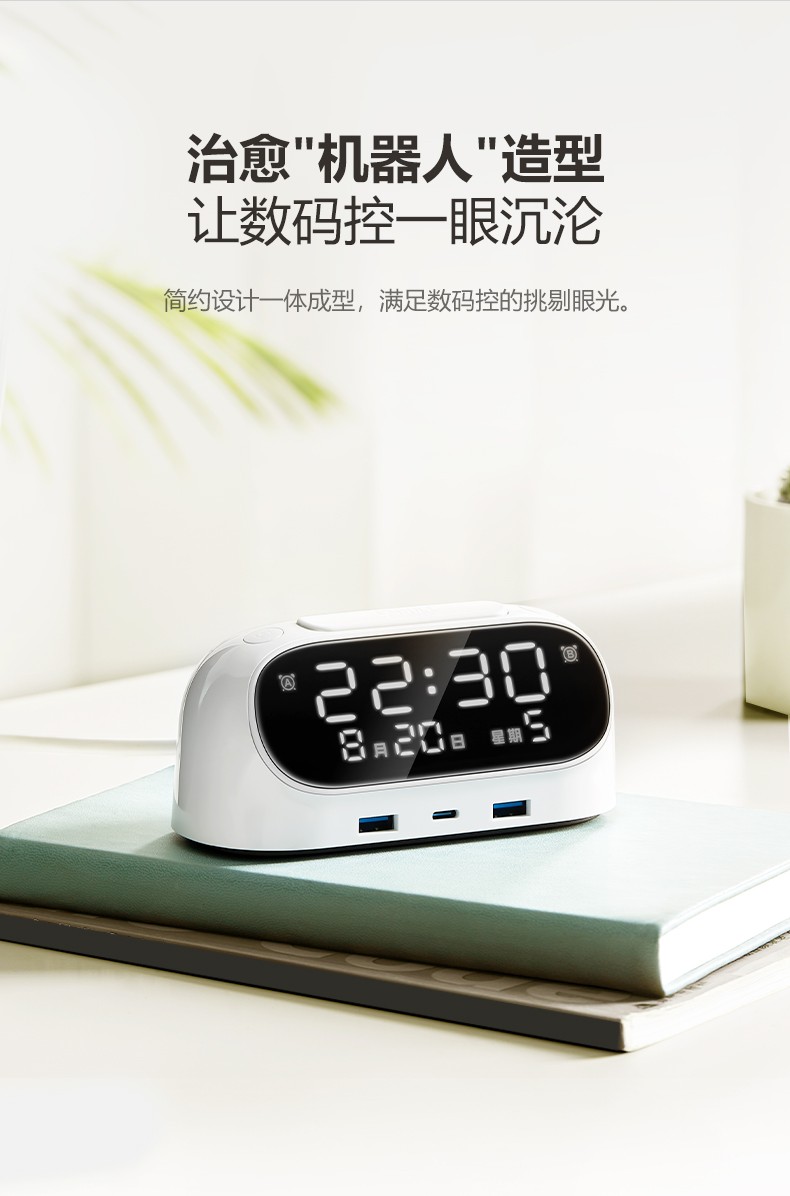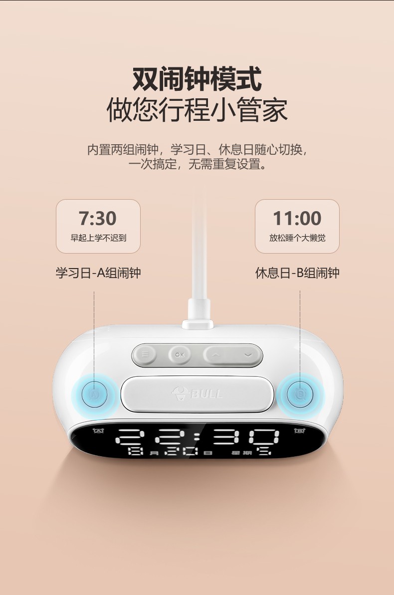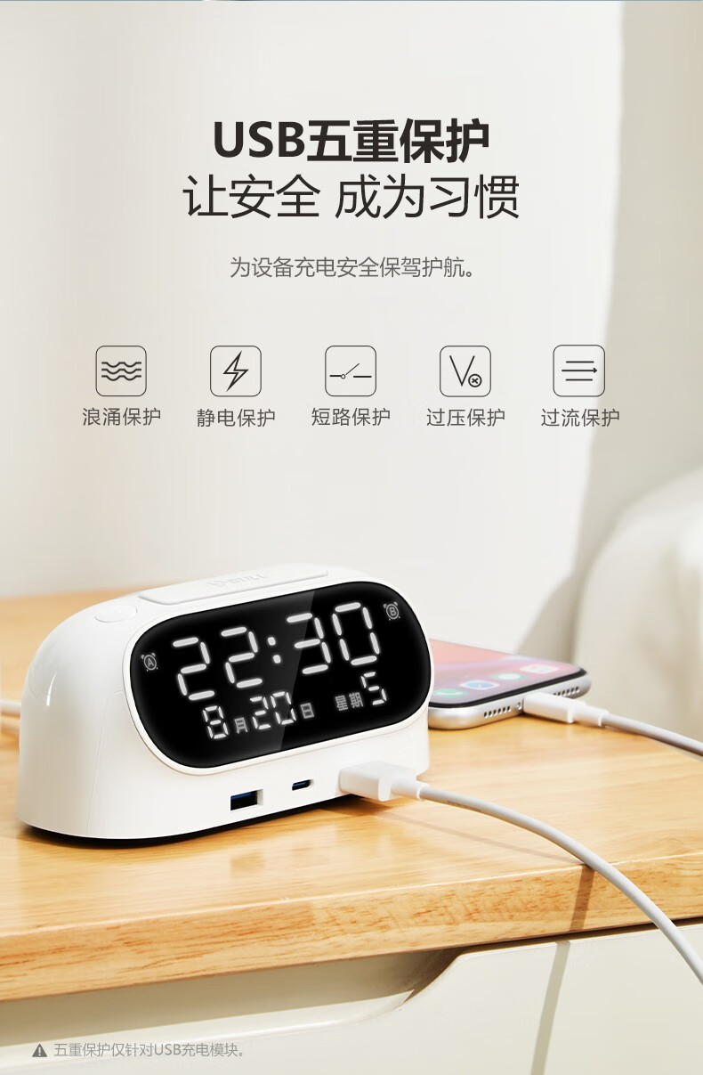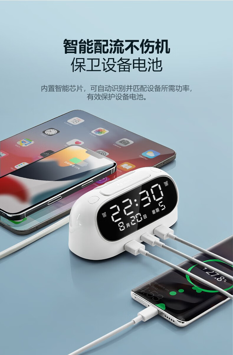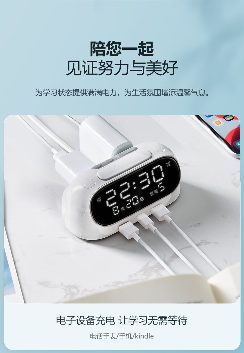 BULL second generation alarm clock charging tungsten bedside socket/plug strip/row plug/C port 20W fast charging 2 2-hole + 3 USB ports (2A 1C) total length 1.1 meters