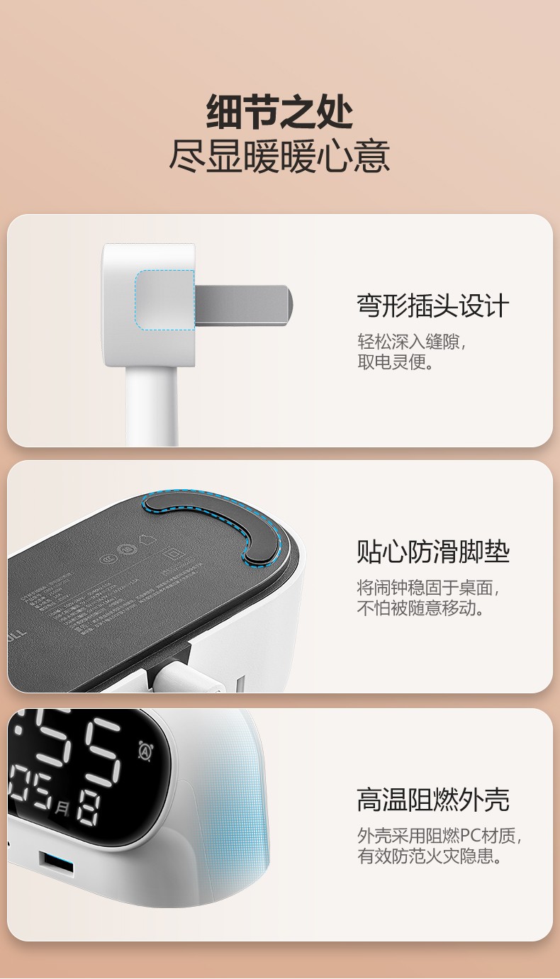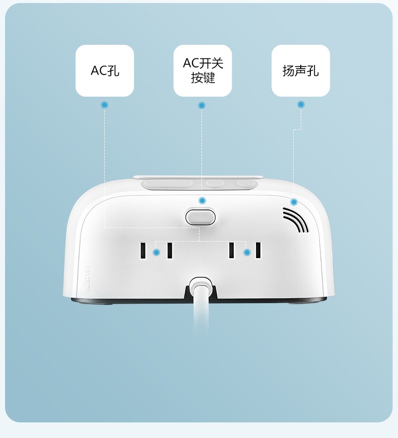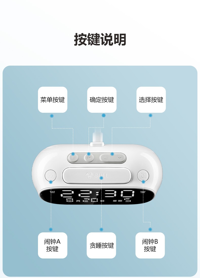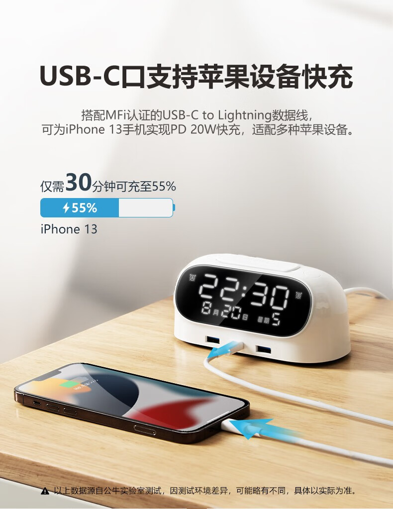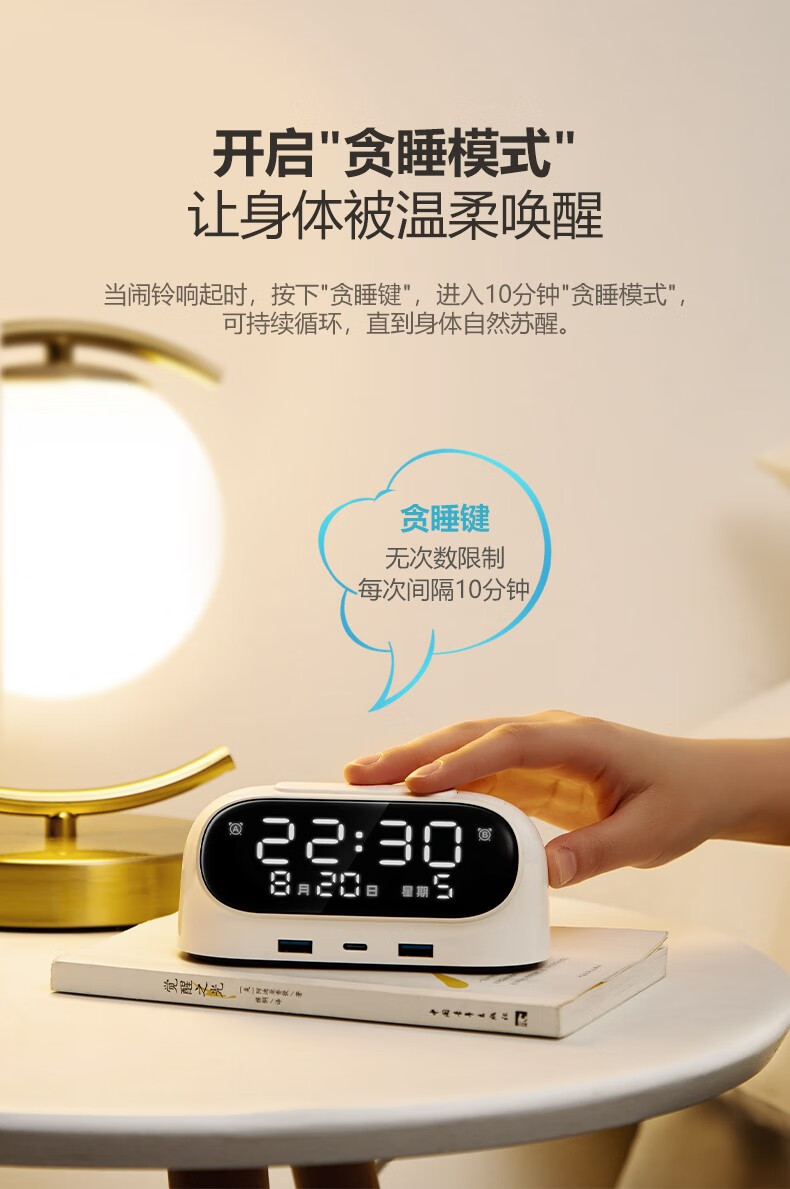 BULL second generation alarm clock charging tungsten bedside socket/plug strip/row plug/C port 20W fast charging 2 2-hole + 3 USB ports (2A 1C) total length 1.1 meters