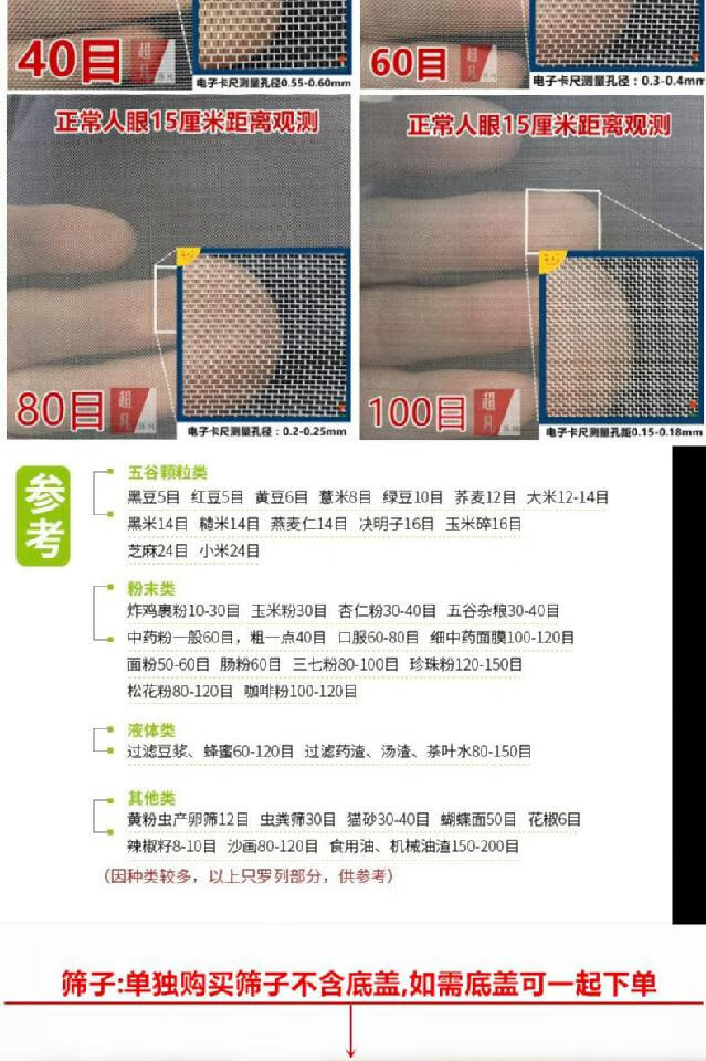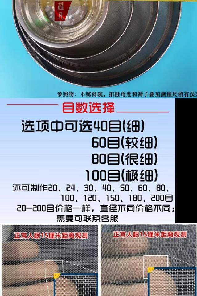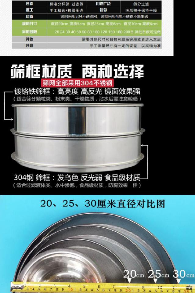 Ultra-fine 304 stainless steel mesh Chinese medicine soybean milk flour sieve 40 mesh 60 mesh 80 mesh 100 mesh handheld sampling sieve diameter 20cm height 6cm 100 mesh