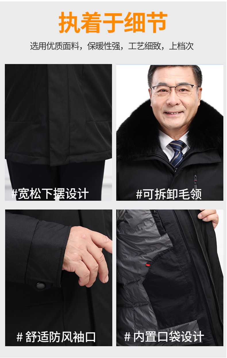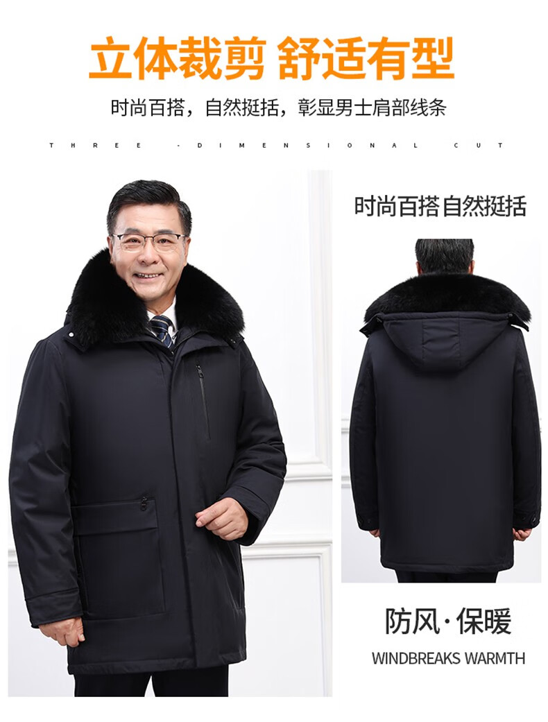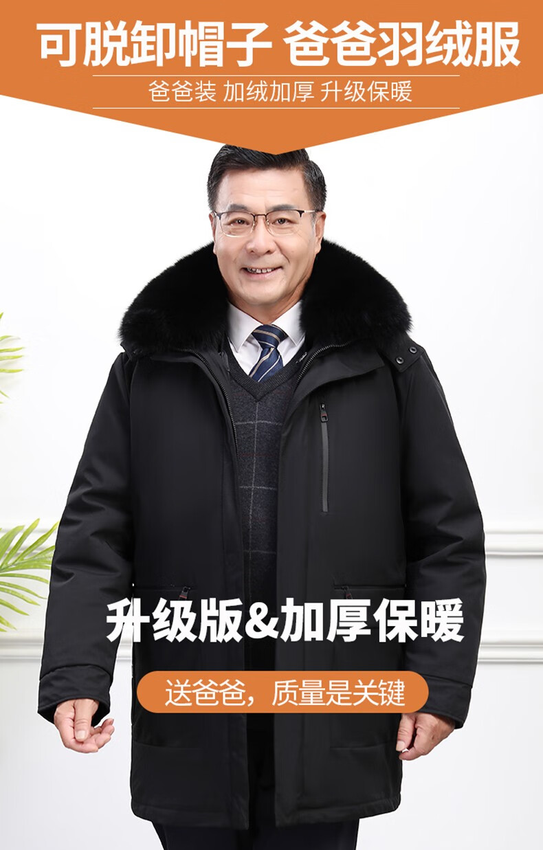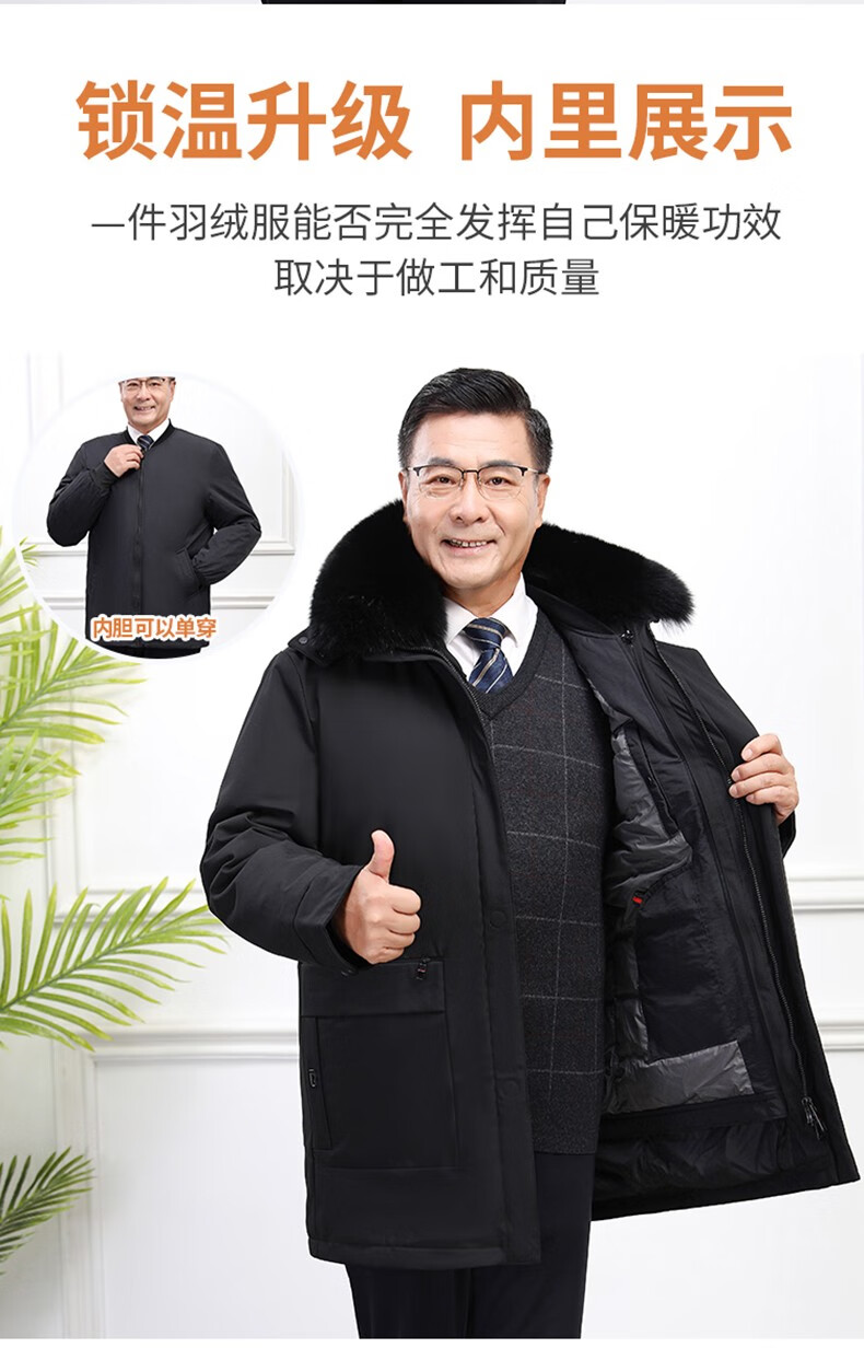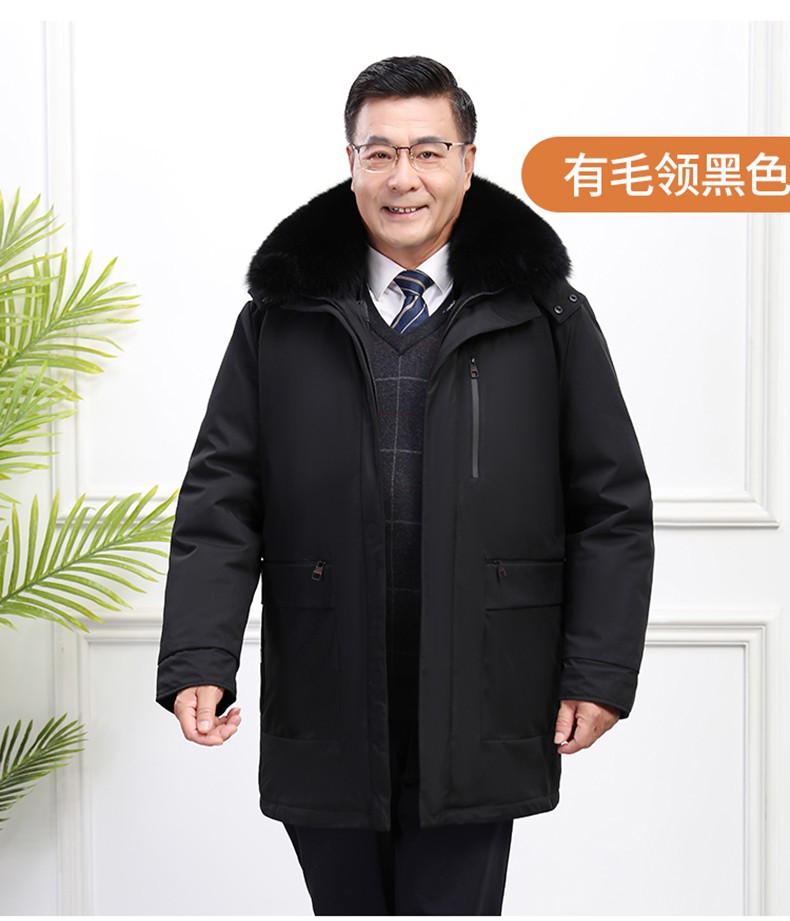 Classic car, middle-aged and elderly down jacket men's winter men's lively mid-length thickened dad winter coat with removable liner grandpa cold-proof and warm duck down jacket with fur collar-black 2XL/185