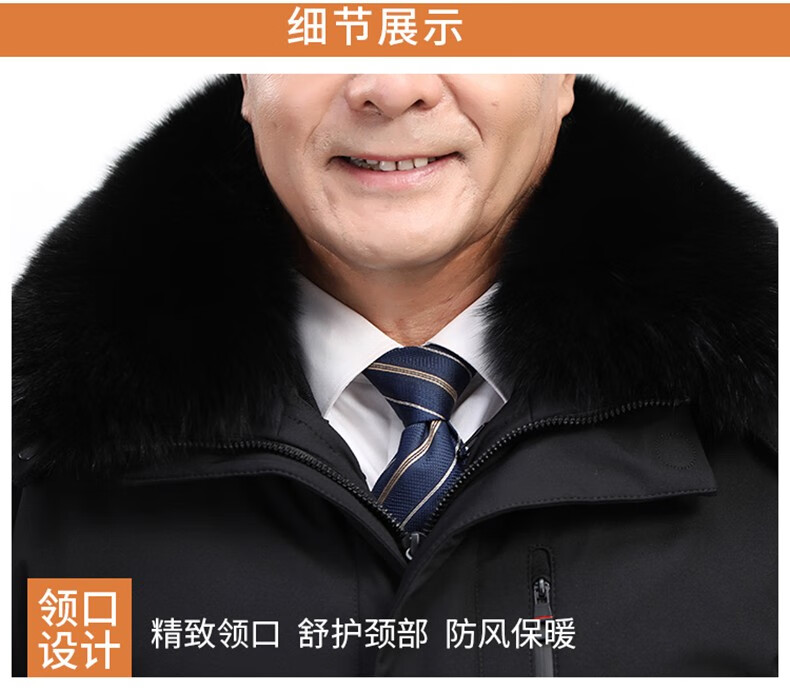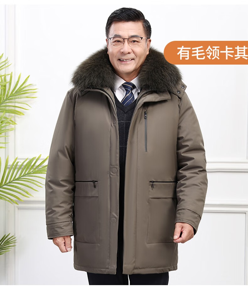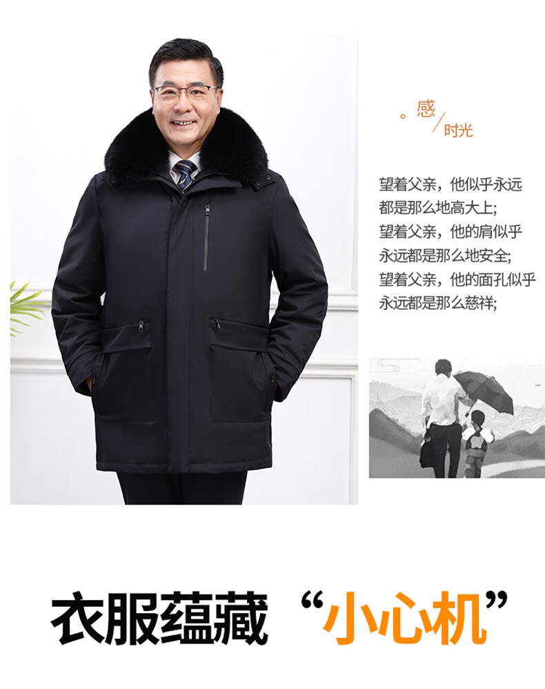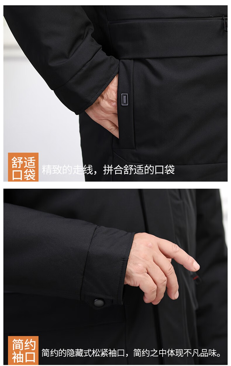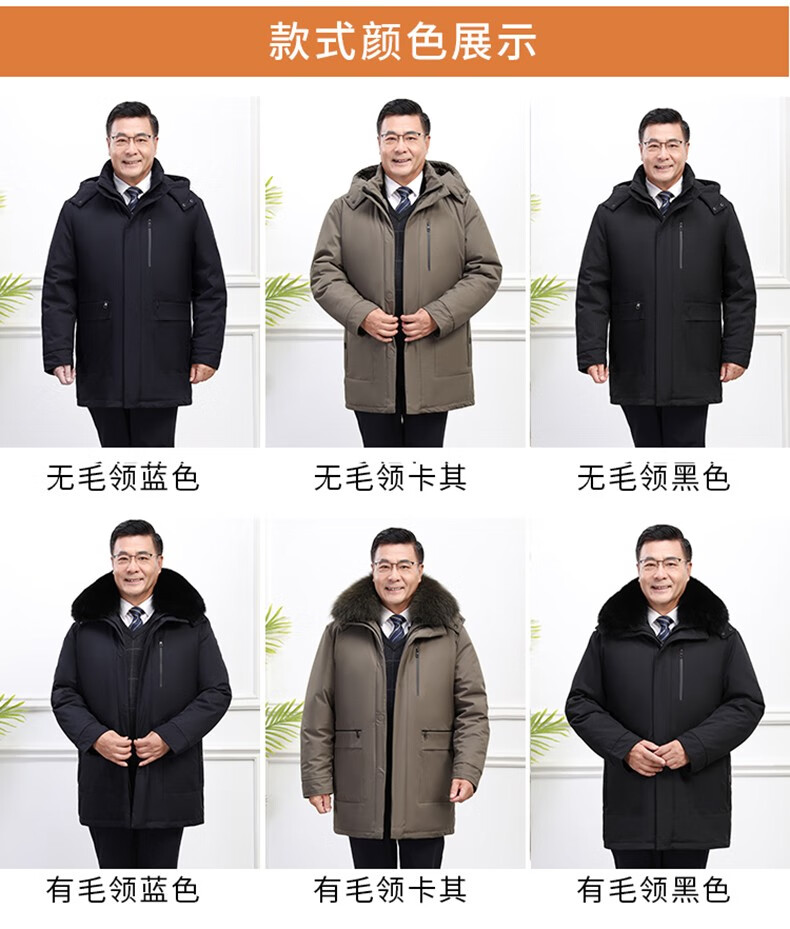 Classic car, middle-aged and elderly down jacket men's winter men's lively mid-length thickened dad winter coat with removable liner grandpa cold-proof and warm duck down jacket with fur collar-black 2XL/185