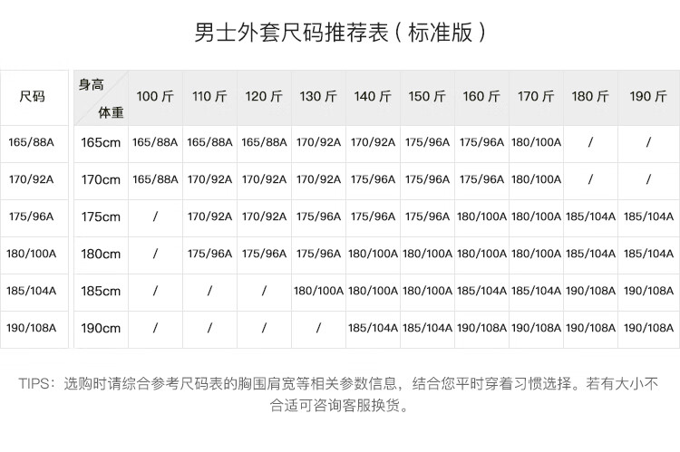 China (cm) 160-165/84-86 165-170 / 88-90 167-172 / 92-96 168-173 / 98-102 170-176 / 106-110