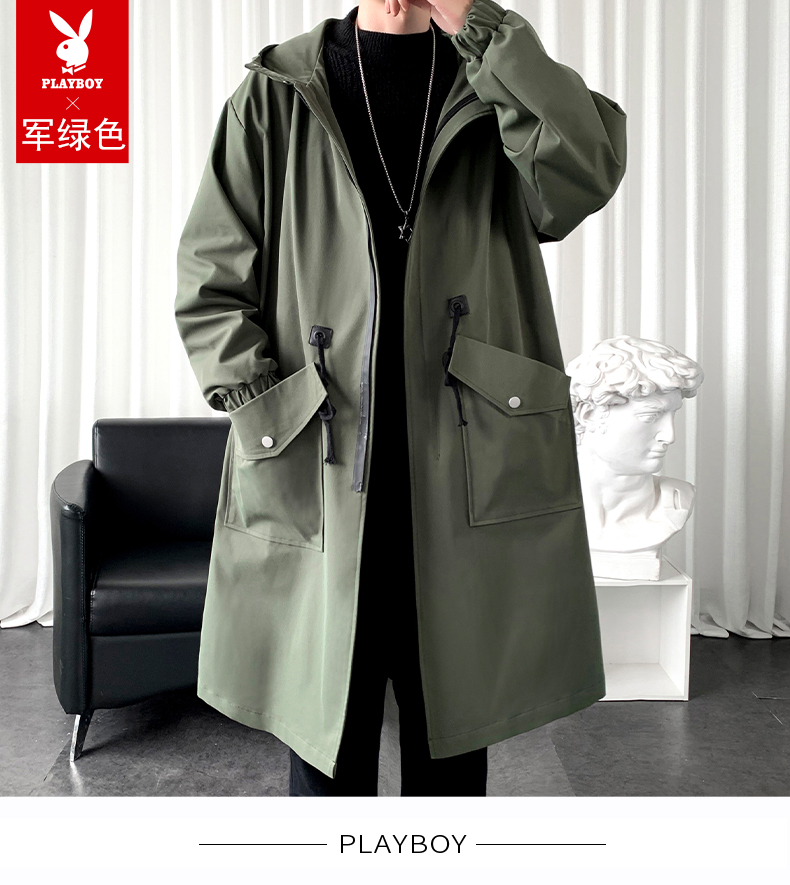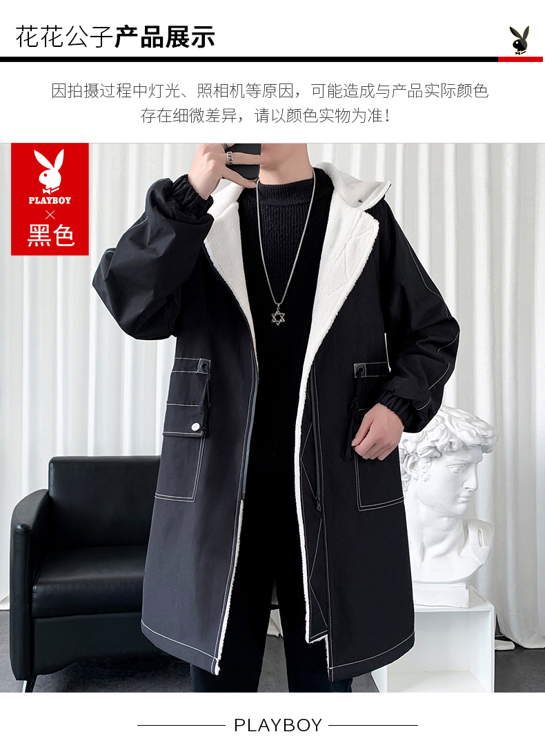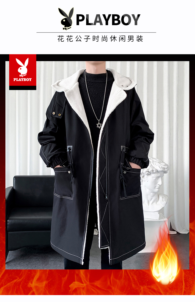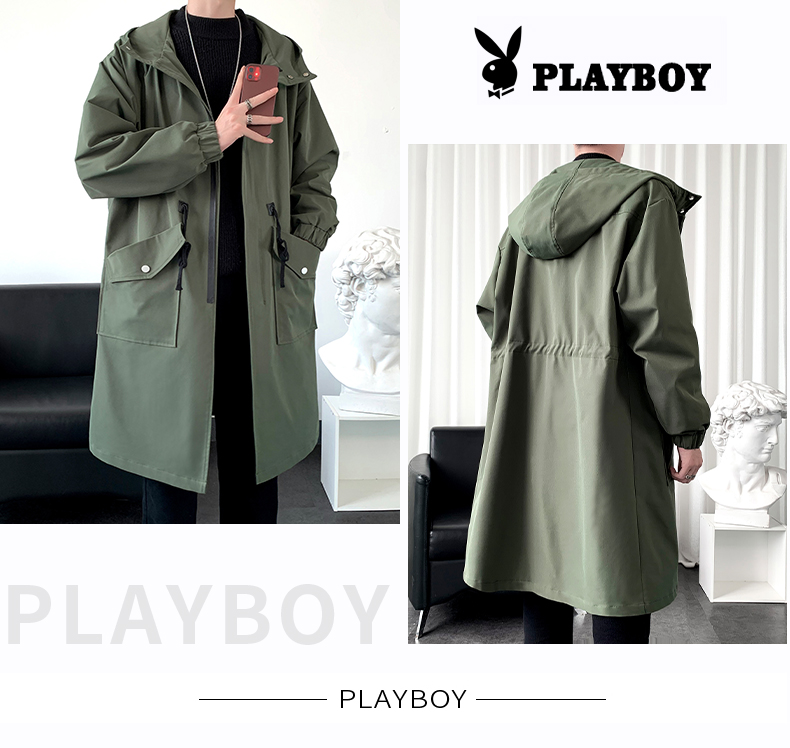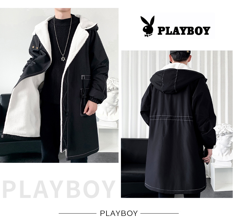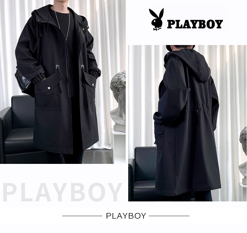 Playboy (PLAYBOY) windbreaker men's mid-length spring and autumn new high-end authentic trendy coat jacket men's hooded loose top men Z-401HHF262 black plus velvet L