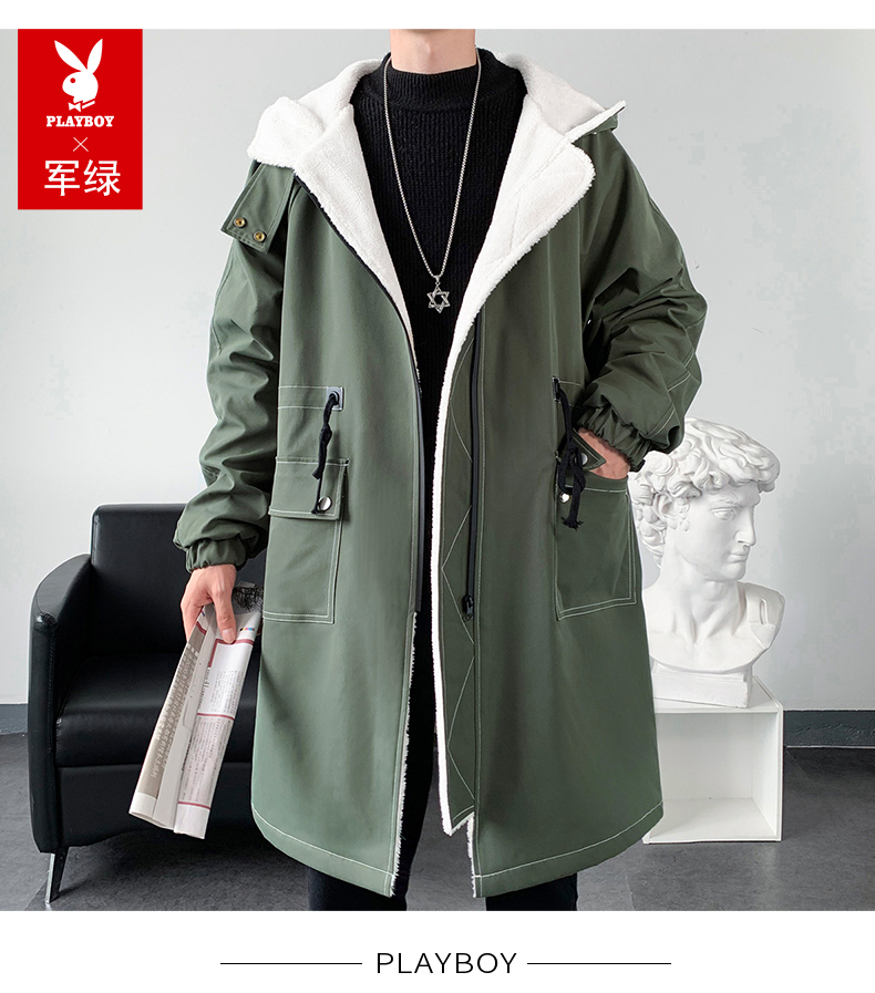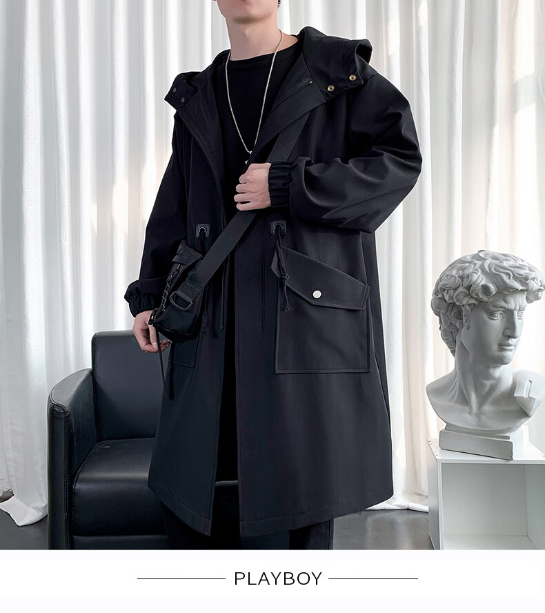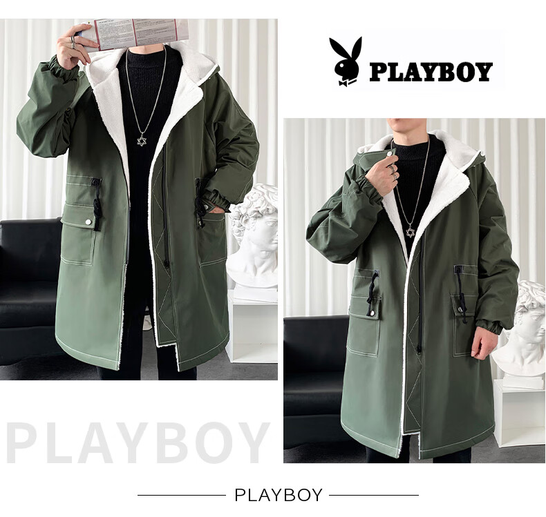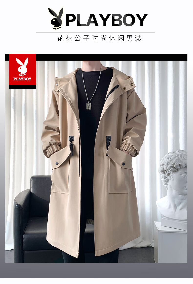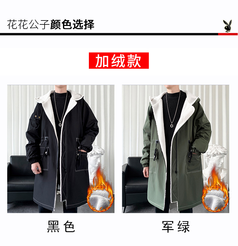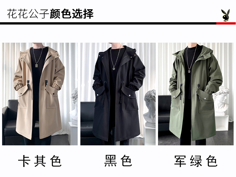 Playboy (PLAYBOY) windbreaker men's mid-length spring and autumn new high-end authentic trendy coat jacket men's hooded loose top men Z-401HHF262 black plus velvet L