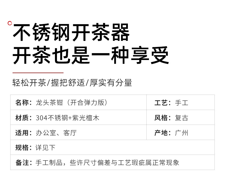 Congjian 304 stainless steel tea tongs Pu'er tea knife tea brick tea cone dismantling tea kung fu tea set accessories tea opener tea cake tool red rosewood faucet tea tongs (opening and closing elastic version)