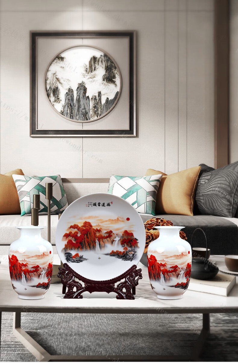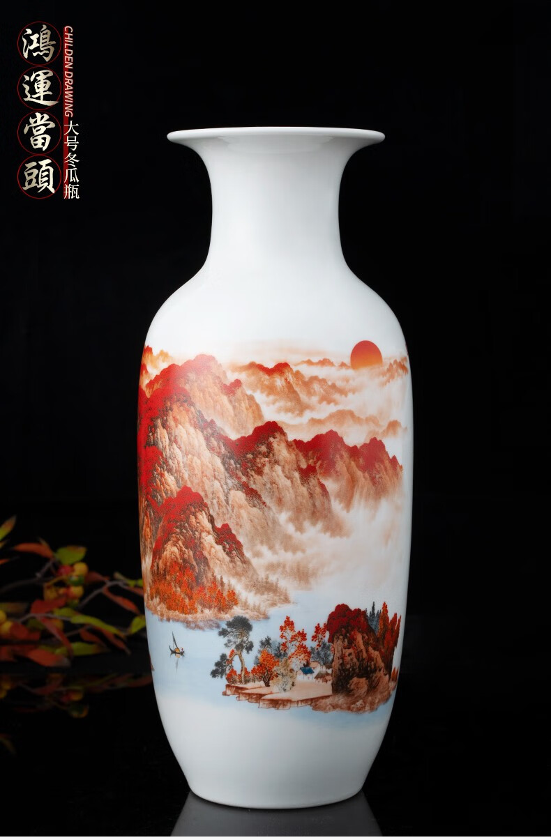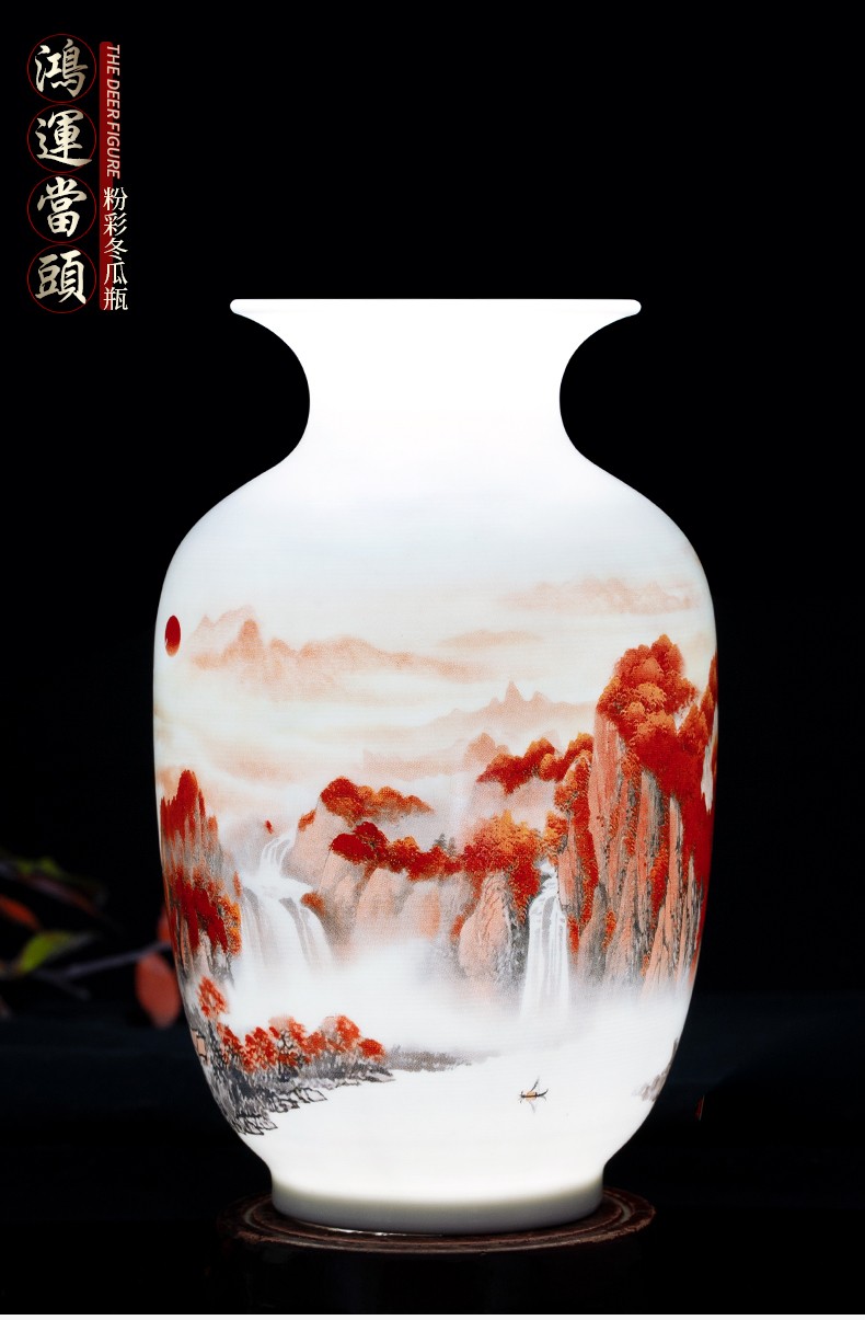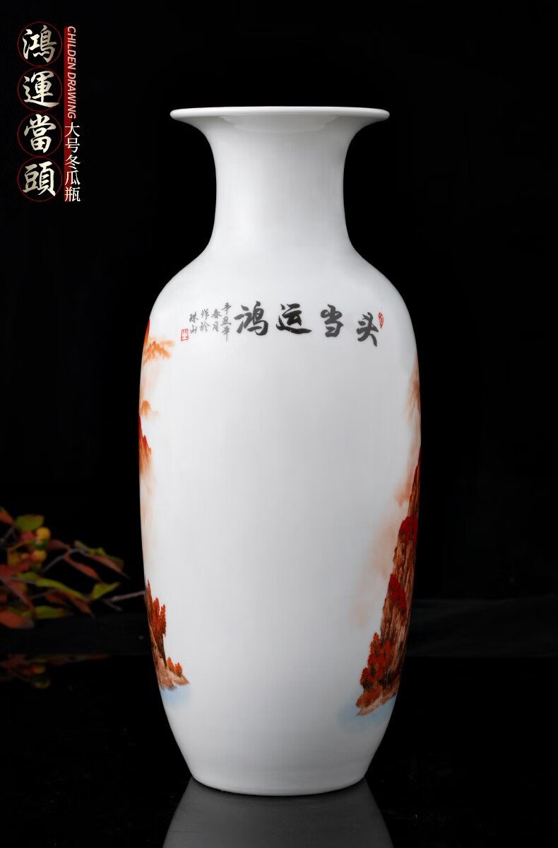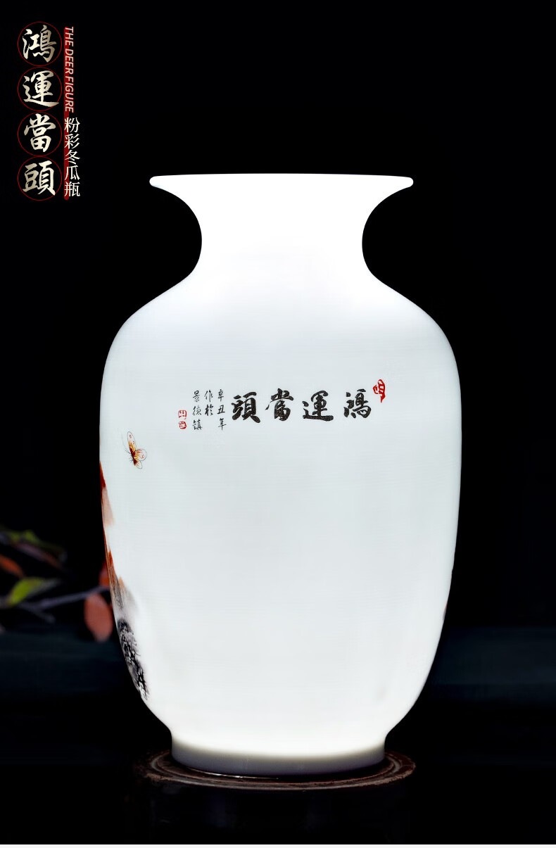 Ziqi Jingdezhen Ceramics Hongyun Dangtou three-piece set of vases, new Chinese style living room wine cabinet, office decorations, Lucky Dangtou winter melon bottle + wooden base 25cm