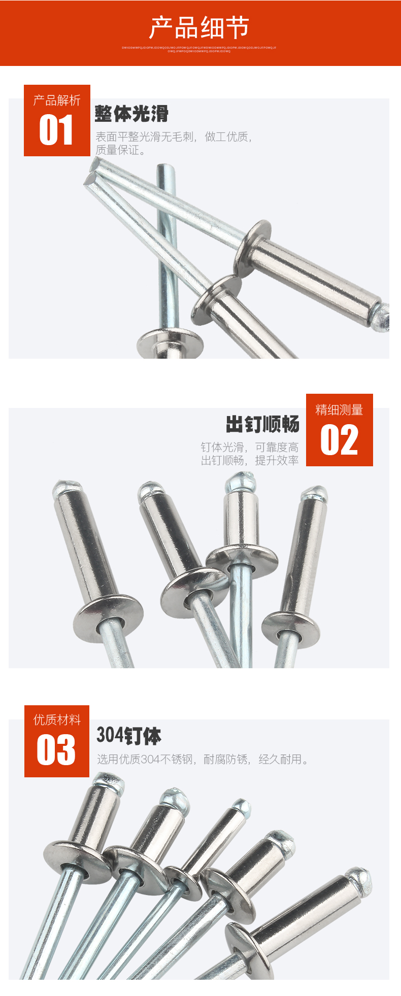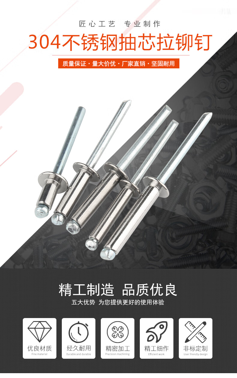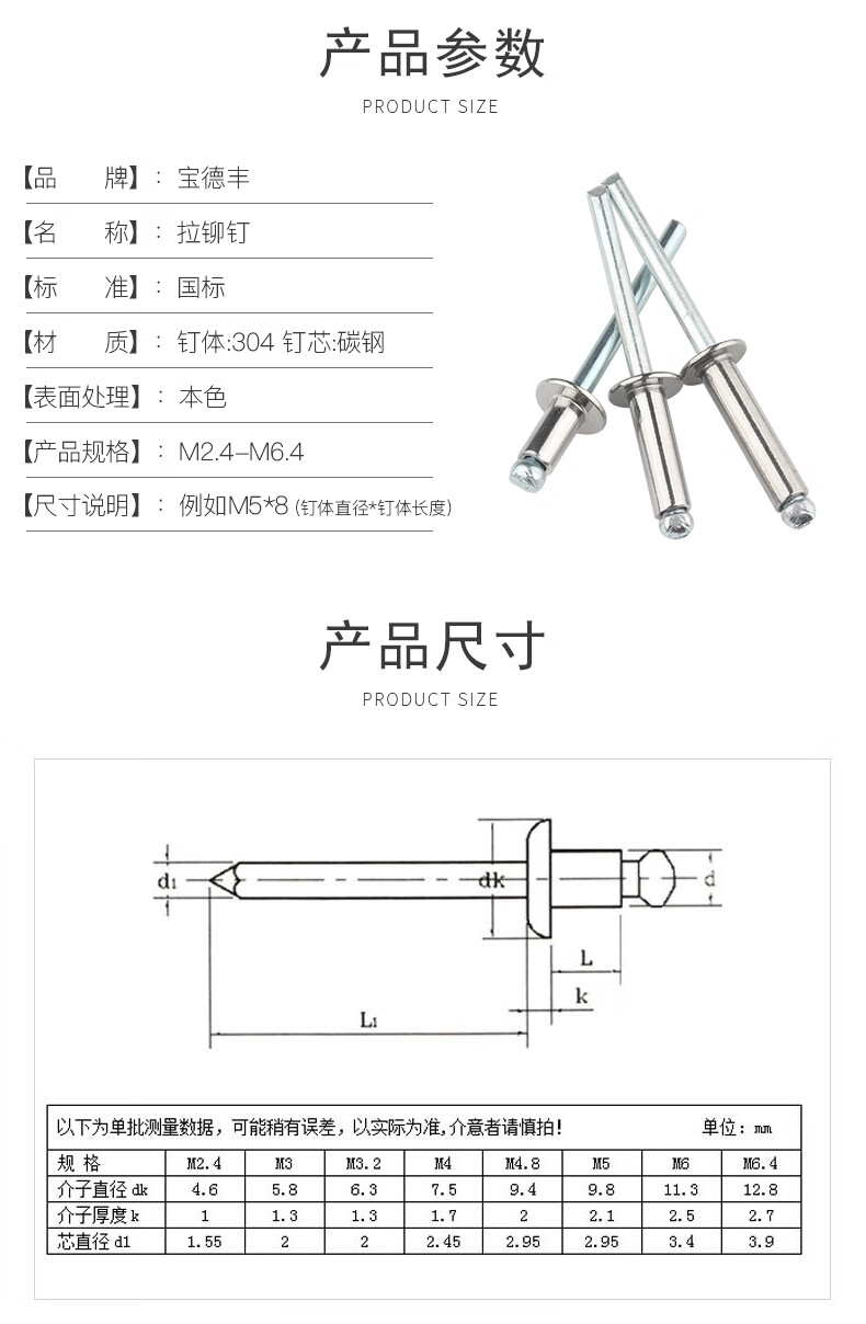 Baodefeng willow rivets 304 stainless steel core blind rivets round head pull rivets 卯 nail center pull decorative nails fasteners collection M3X10 50 pieces 304 semi-steel open type