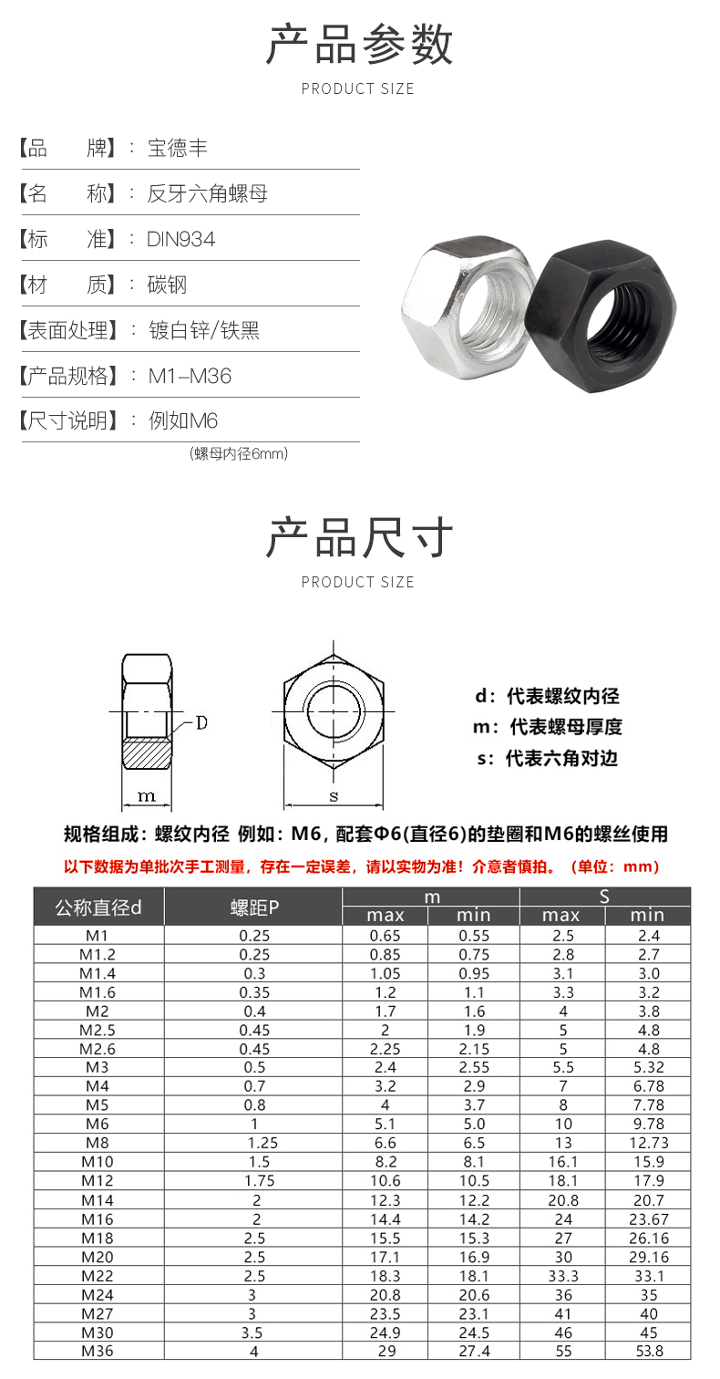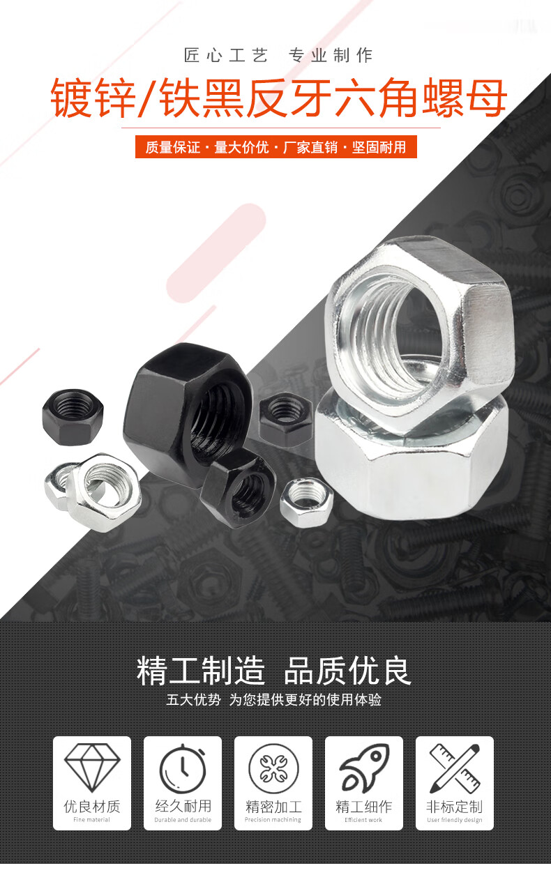 Baodefeng anti-thread hexagonal nut left-hand left-thread nut anti-thread anti-buckle nut M4M5/M6M8/M10M12/M14 8.8 grade iron black anti-thread M10 10 pieces