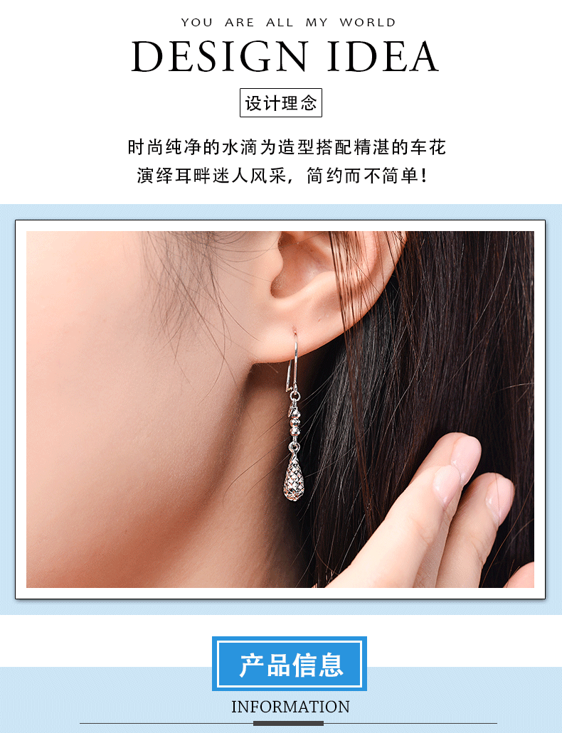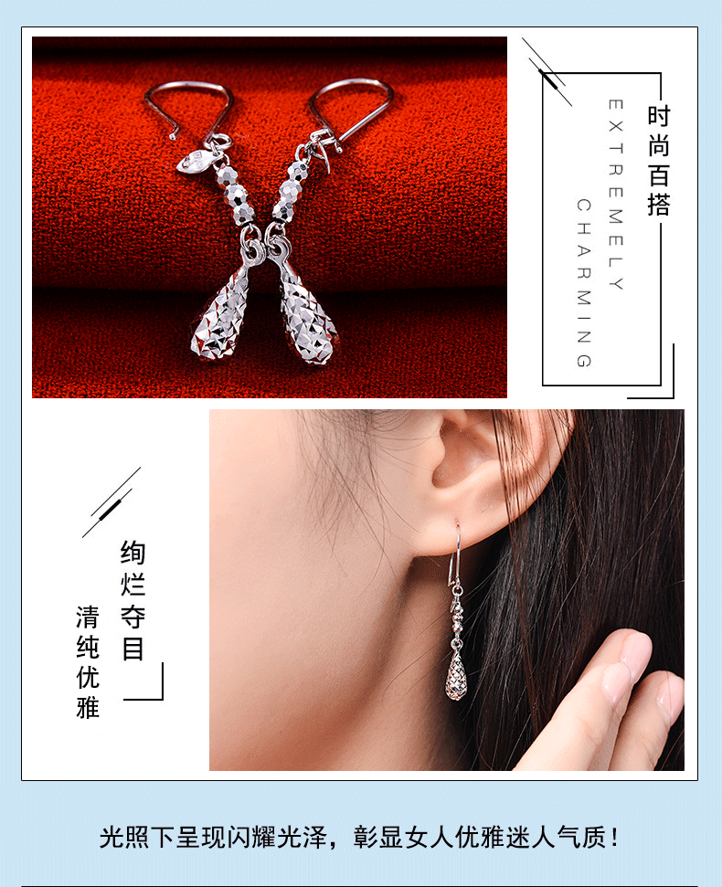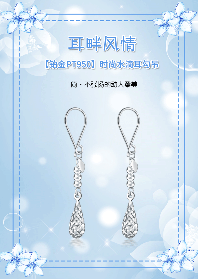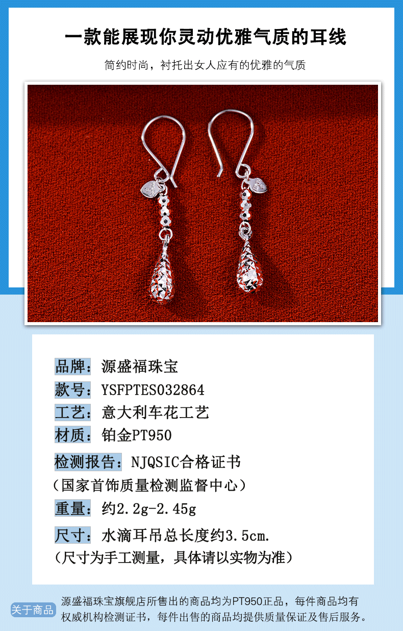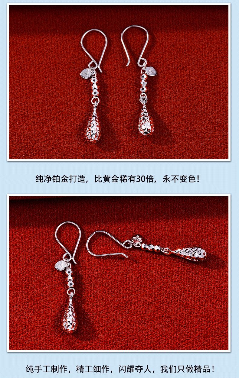 Yuan Shengfu's new PT950 fashionable shiny water drop platinum ear hooks fashionable platinum earrings 2.57g