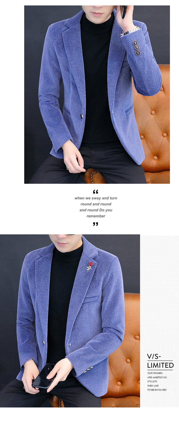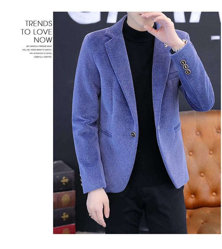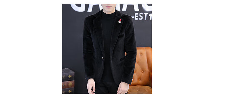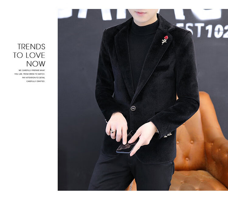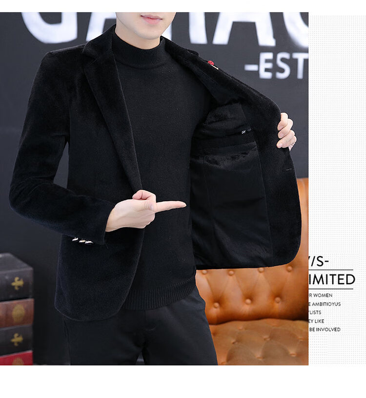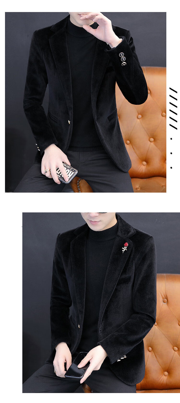 Pierre Cardin autumn and winter velvet solid color small suit men's trendy slim and handsome single suit business casual woolen suit jacket thickened black L