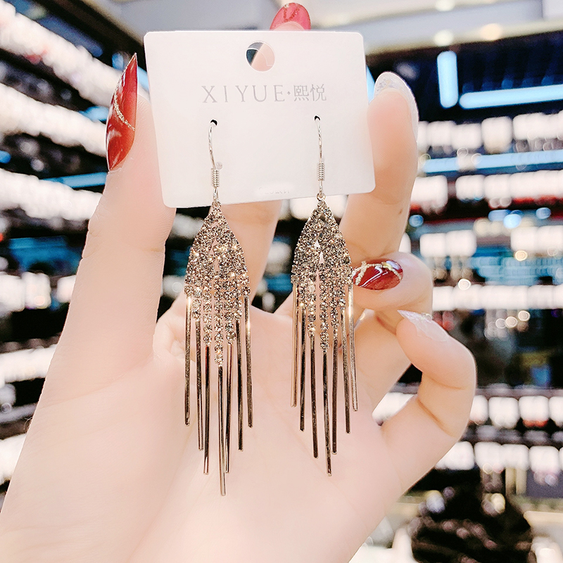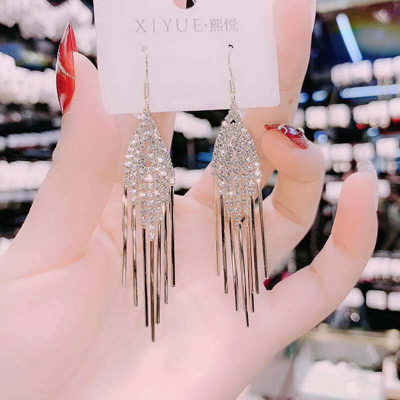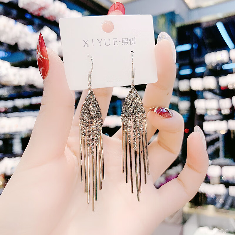 MOYANYU high-end light luxury geometric tassel earrings women's long face-slimming earrings temperament full diamond Internet celebrity ear jewelry gold ear hook style
