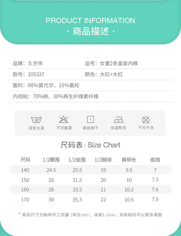 JiuSuiBan children's underwear girls big red zodiac year modal thin briefs briefs for big children baby girls big red 2 pairs 160 / height 150-162 weight 90-105 Jin Jin is equal to 0.5 kg