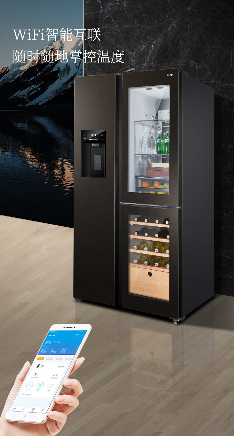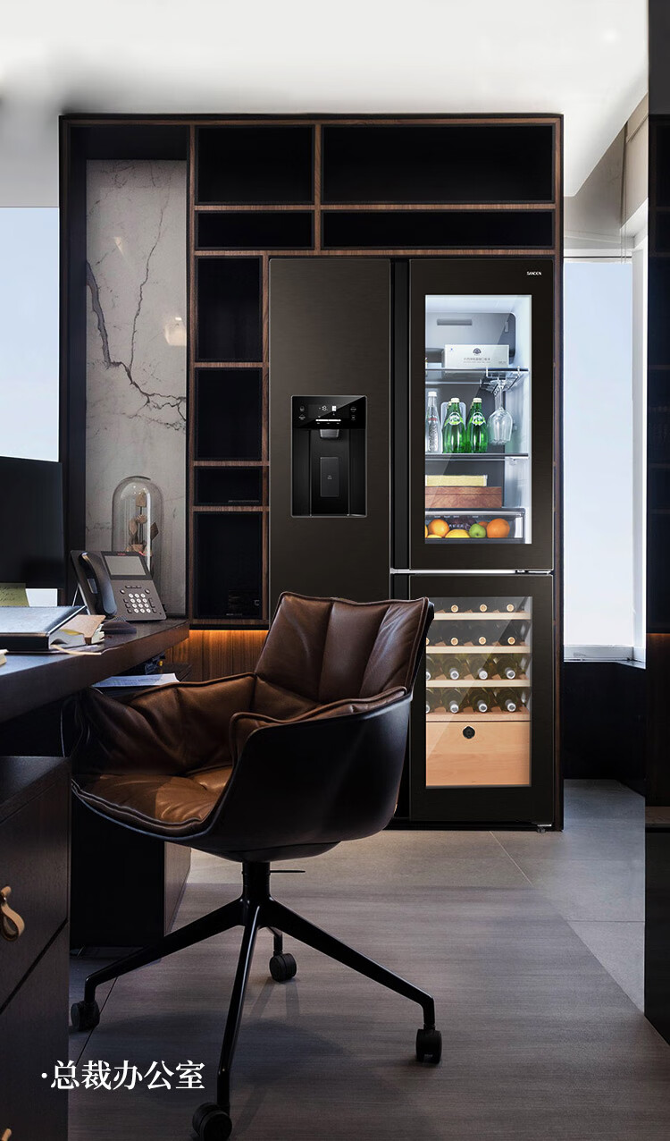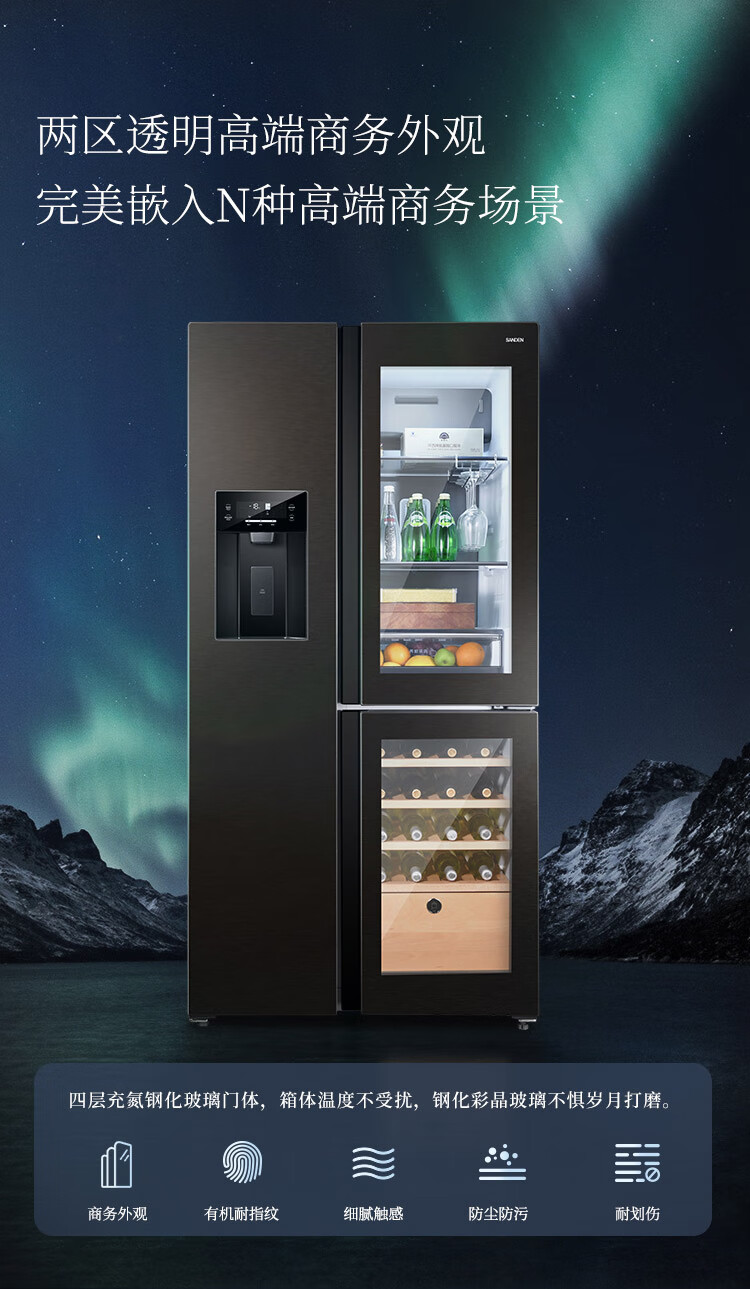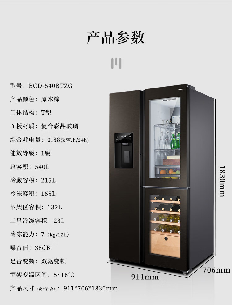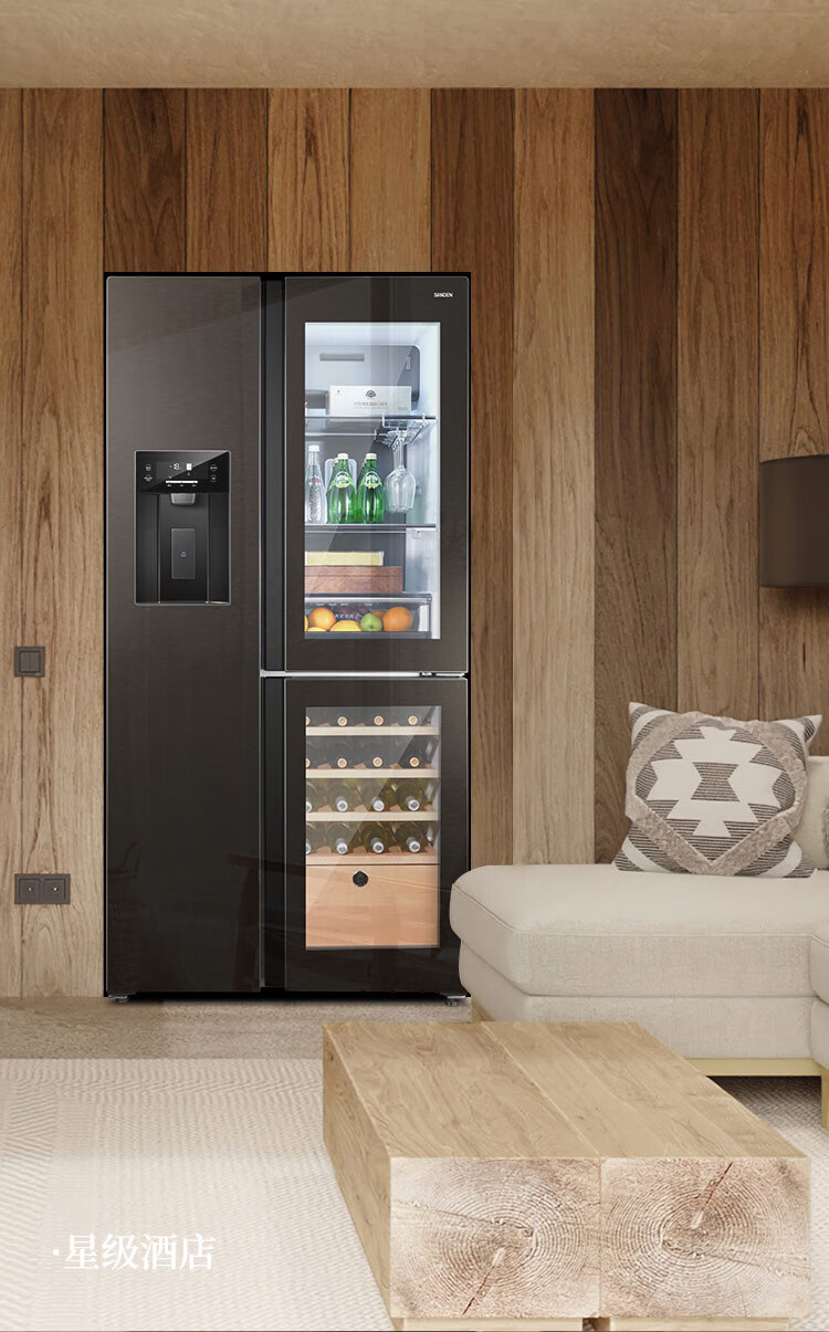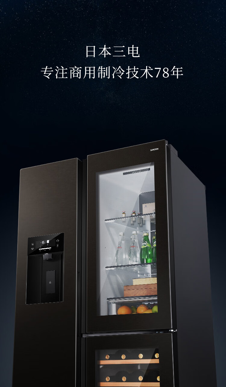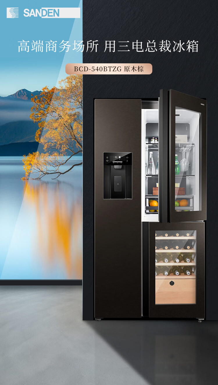 SANDEN Japan Sanden 540L T-shaped high-end glass first-class dual-frequency air-cooled commercial president refrigerator office home ice bar red wine cabinet fully automatic ice machine refrigerator BCD-540BTZG fully automatic ice machine + wine cabinet log brown
