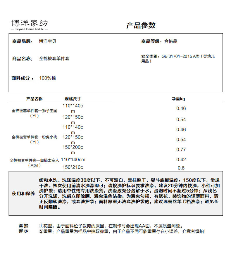 Boyang Baby (Beyond Kids) cotton children's quilt cover single piece set newborn pure cotton infant baby cartoon quilt cover kindergarten 40 pieces cotton quilt cover single piece set Lion Kingdom 120cm*150cm