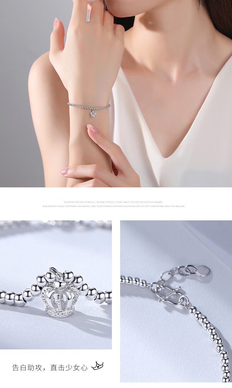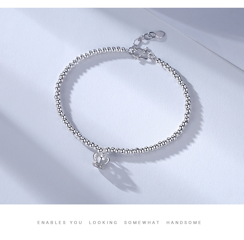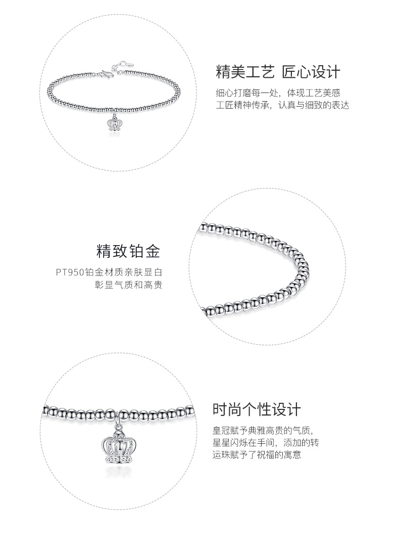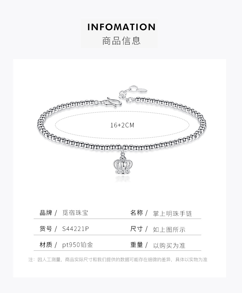 Misu Platinum Ball Bead Bracelet for Women PT950 Platinum Pearl Crown Pendant Bracelet Fashion Birthday Gift Weight 6.5-6.7g Length 16+2cm Thickness 2.5mm
