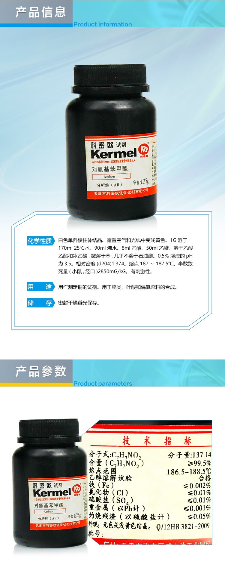 Sinopharm Reagents Tianjin Comeo Para-Aminobenzoic Acid PABA Analytical Pure AR Shanghai Test 25g 100g Sinopharm Reagents 100g