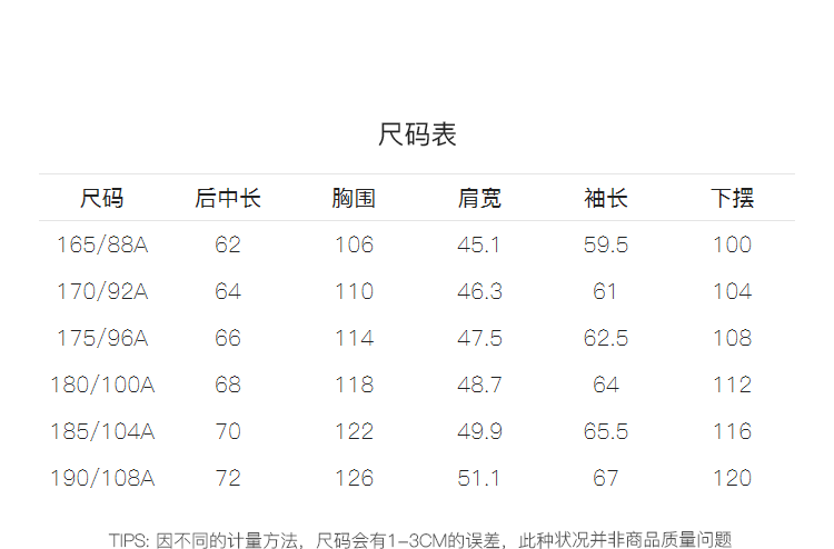 China (cm) 165 / 88-90 170 / 96-98 175 / 108-110 180 / 118-122 185 / 126-130
