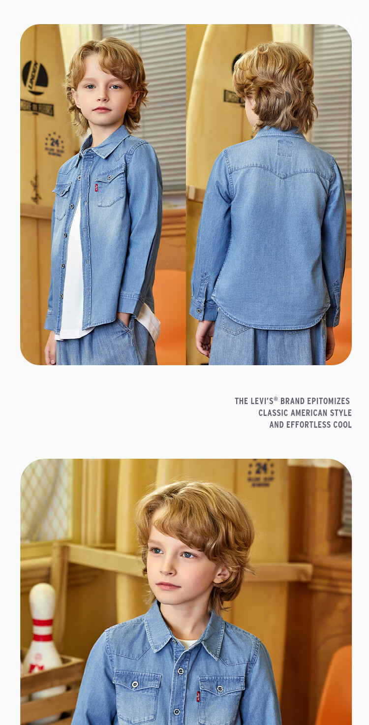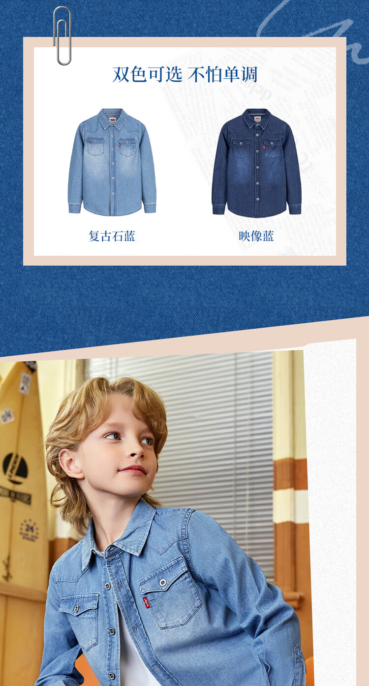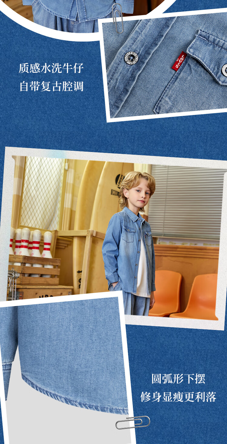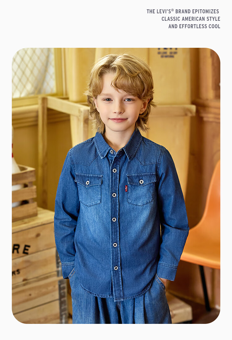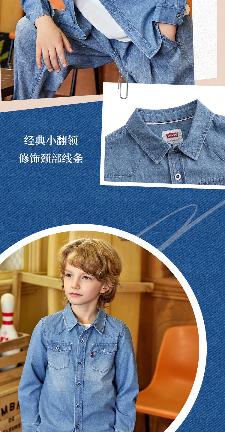 Levi s Levi's children's denim shirt spring and autumn pure cotton comfortable children's long-sleeved shirt retro stone blue 110/52 recommended height 98-104cm