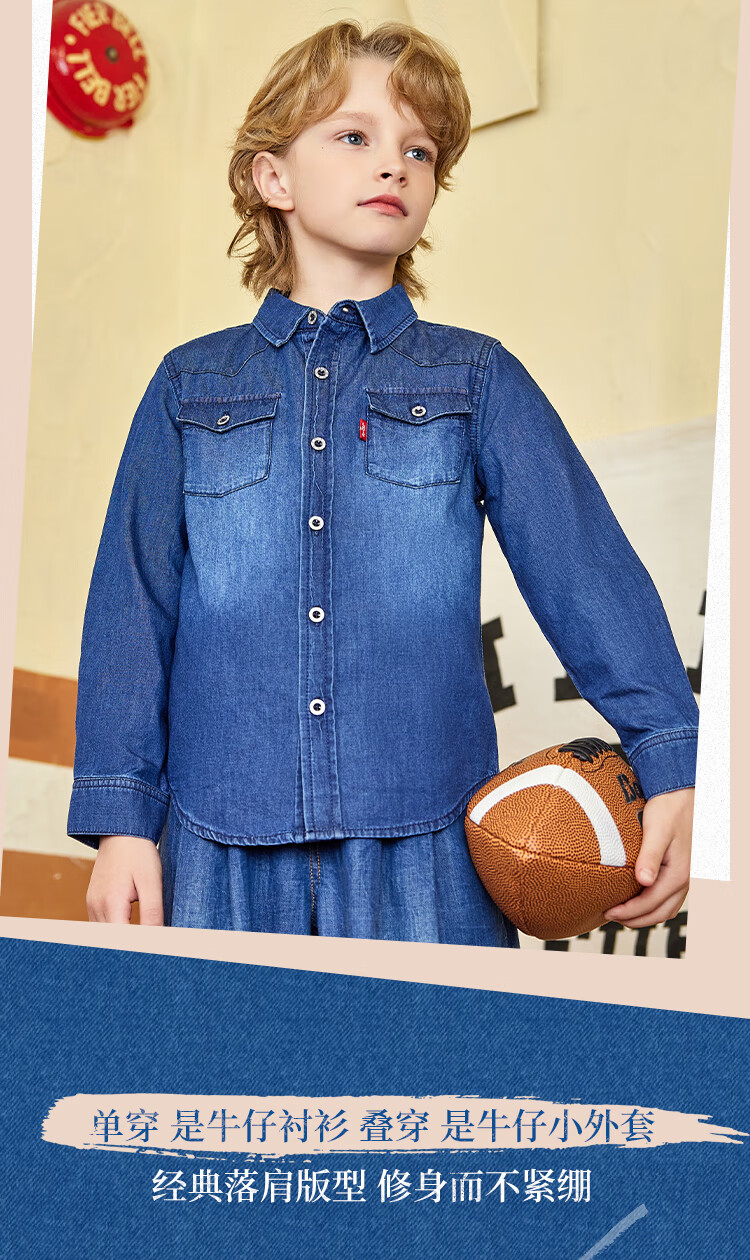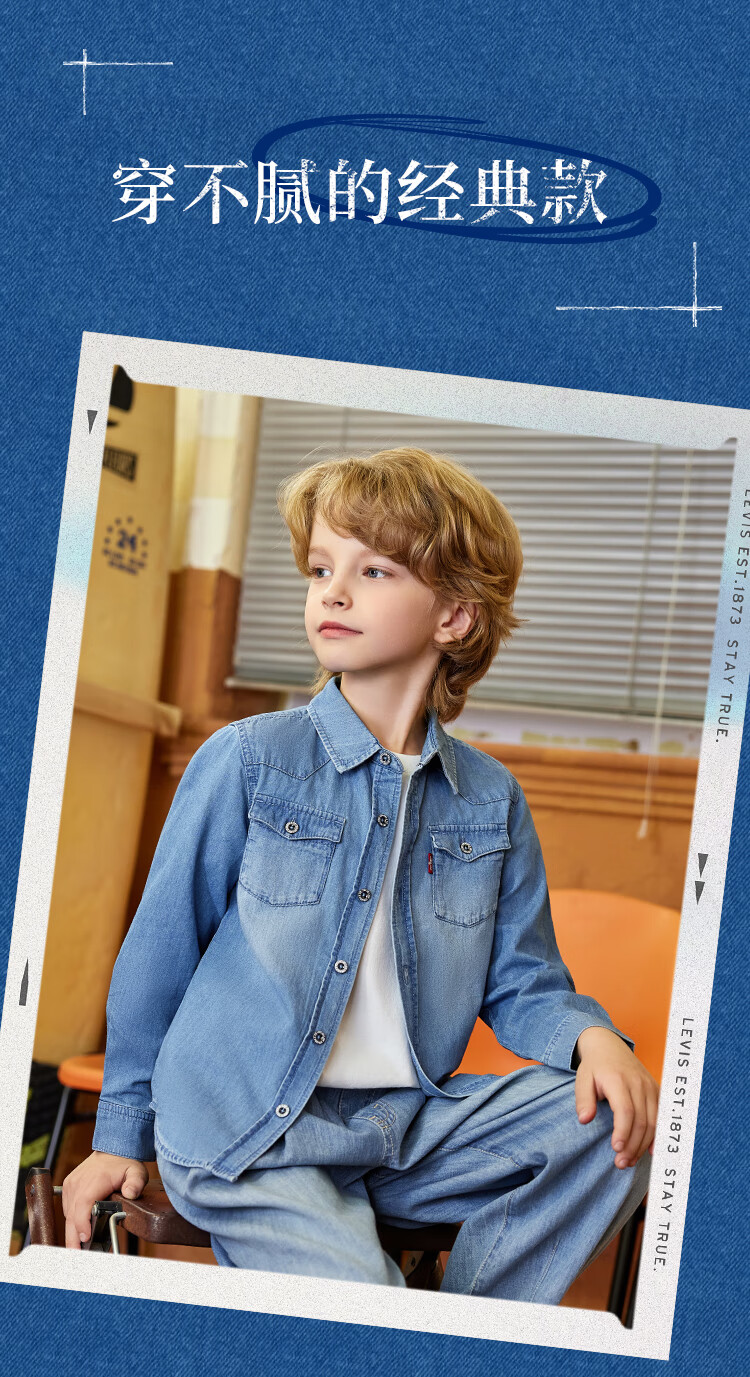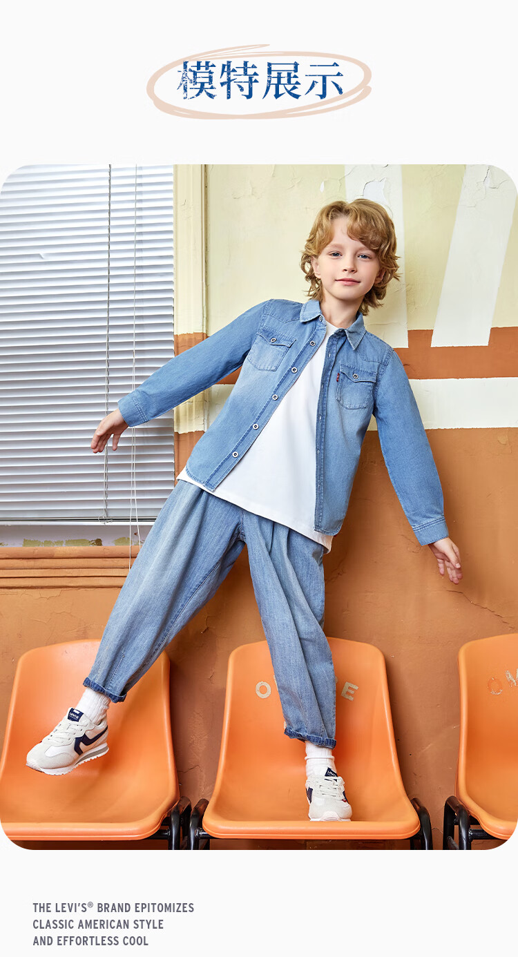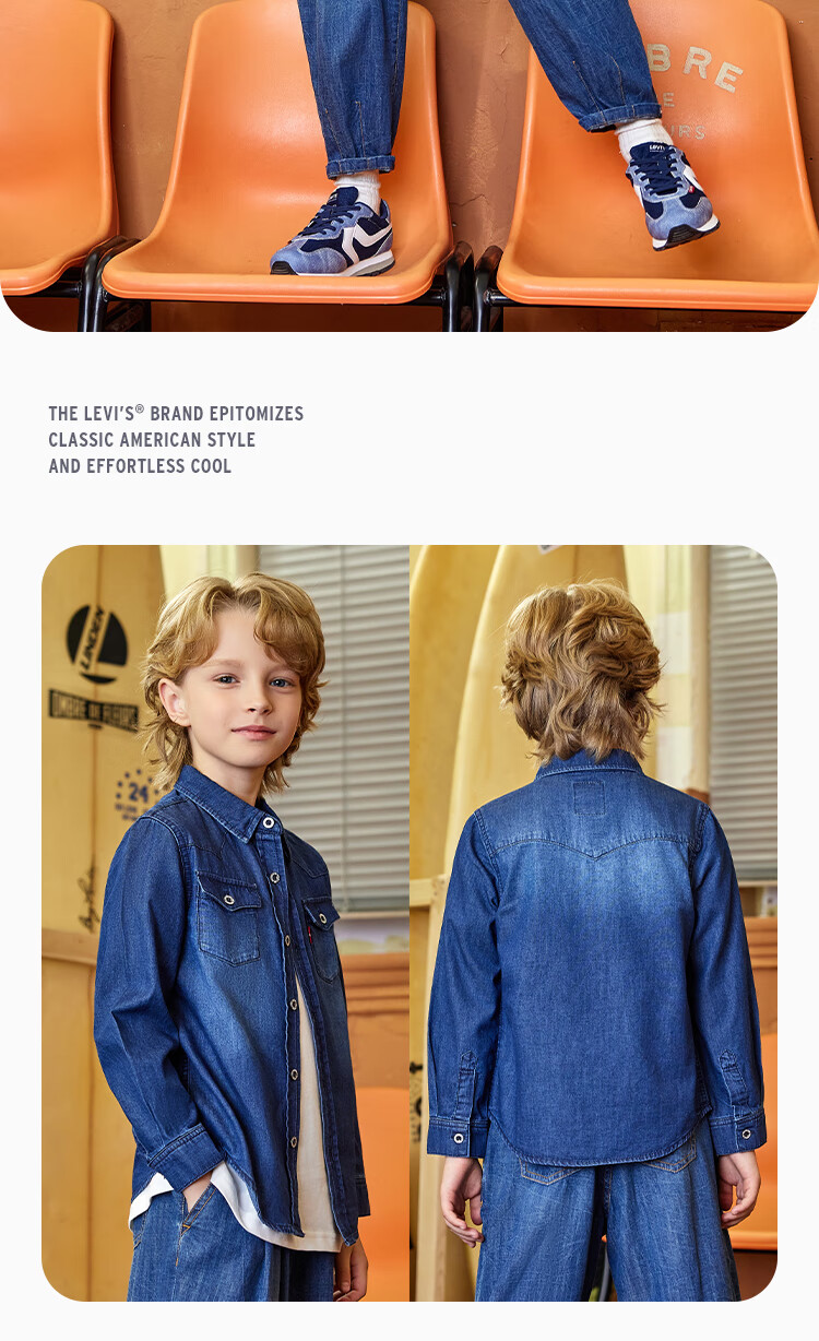 Levi s Levi's children's denim shirt spring and autumn pure cotton comfortable children's long-sleeved shirt retro stone blue 110/52 recommended height 98-104cm