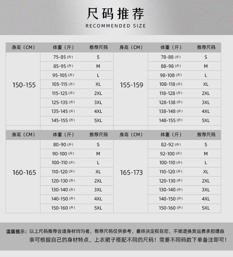 China (cm) 160-165/84-86 165-170 / 88-90 167-172 / 92-96 168-173 / 98-102 170-176 / 106-110