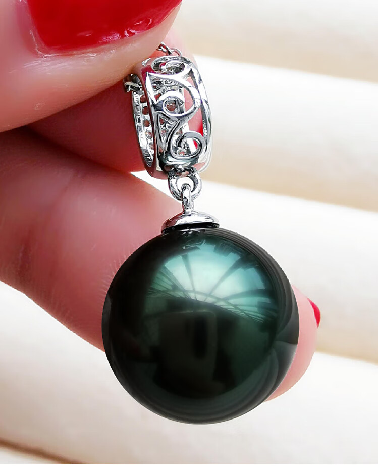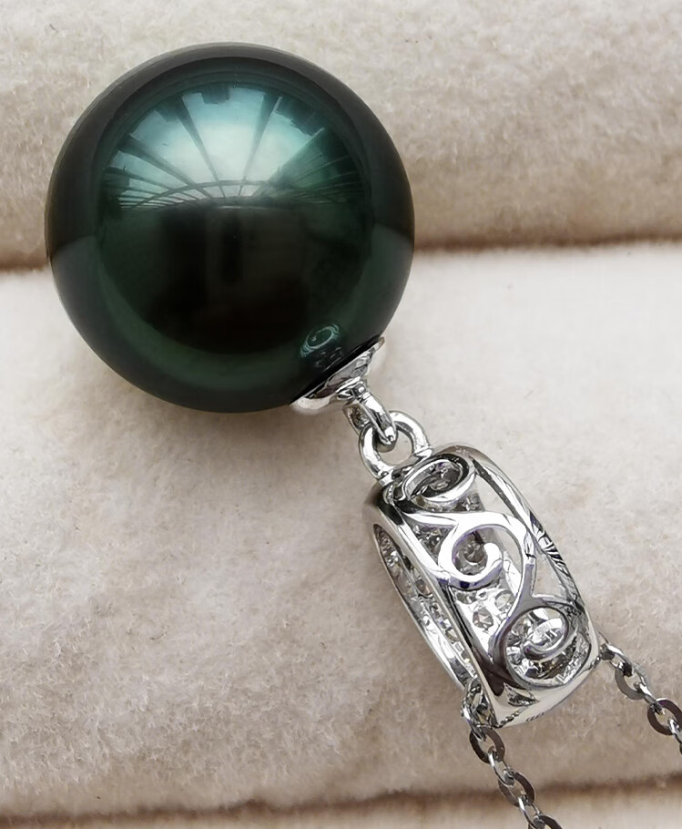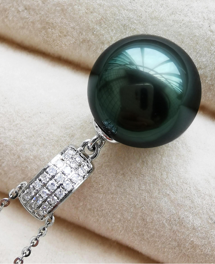 Mohs Tahitian black pearls and malachite green pendant, seawater pearls, necklace, 18K gold diamond, perfect round, flawless and bright style, malachite green 13-14mm
