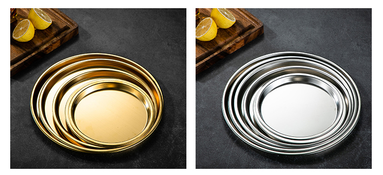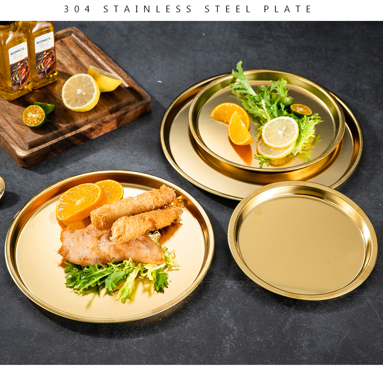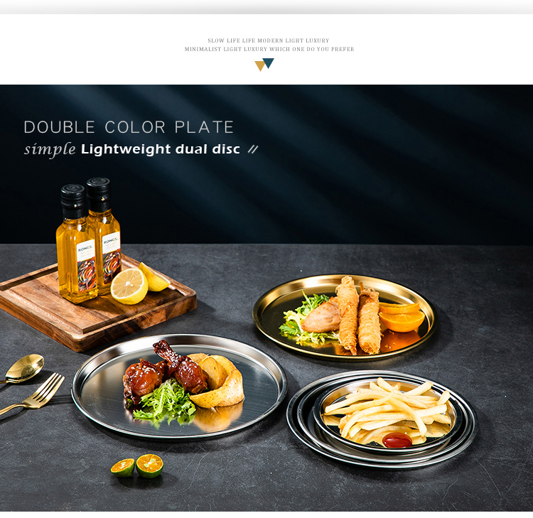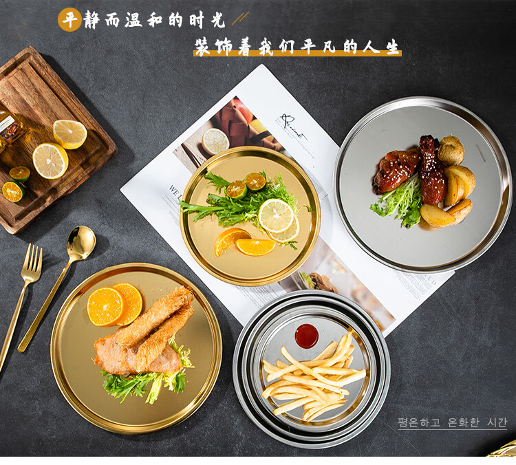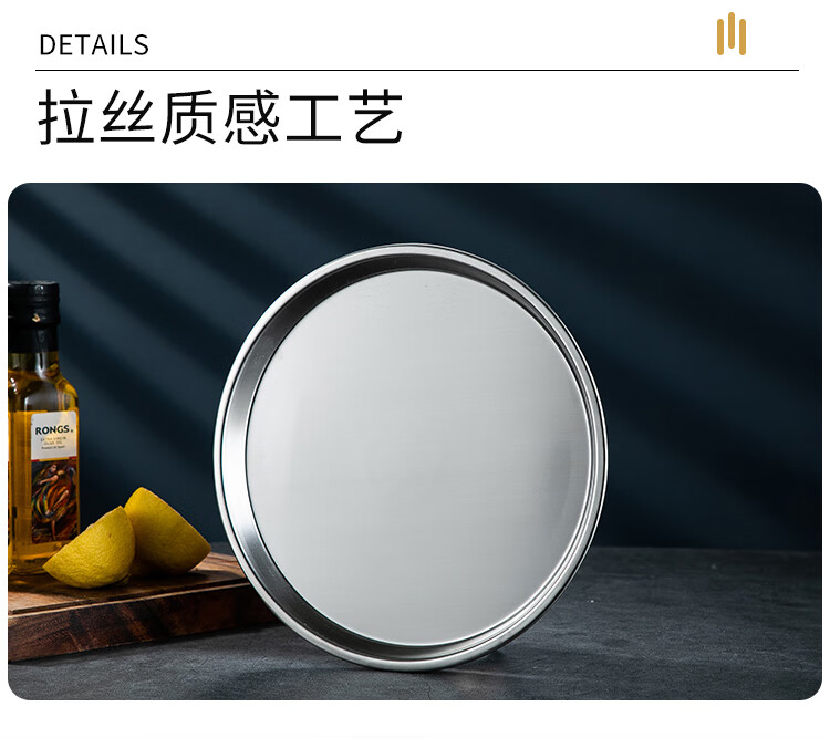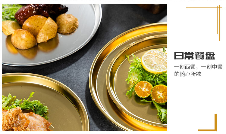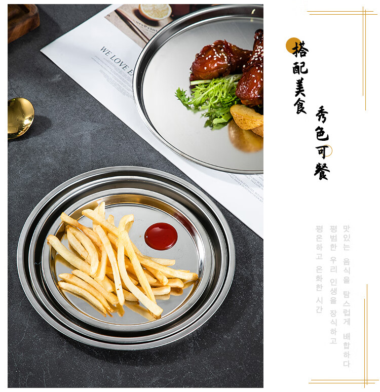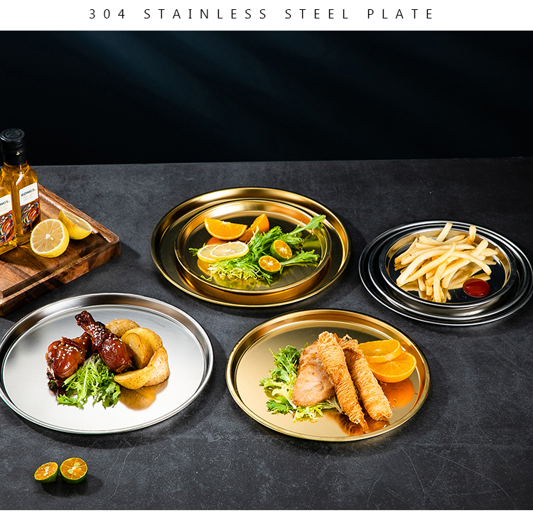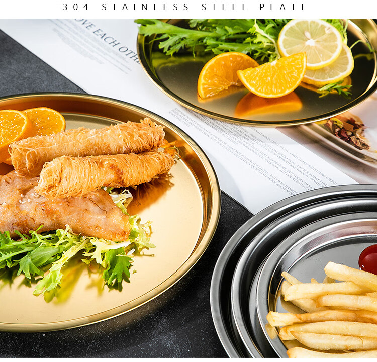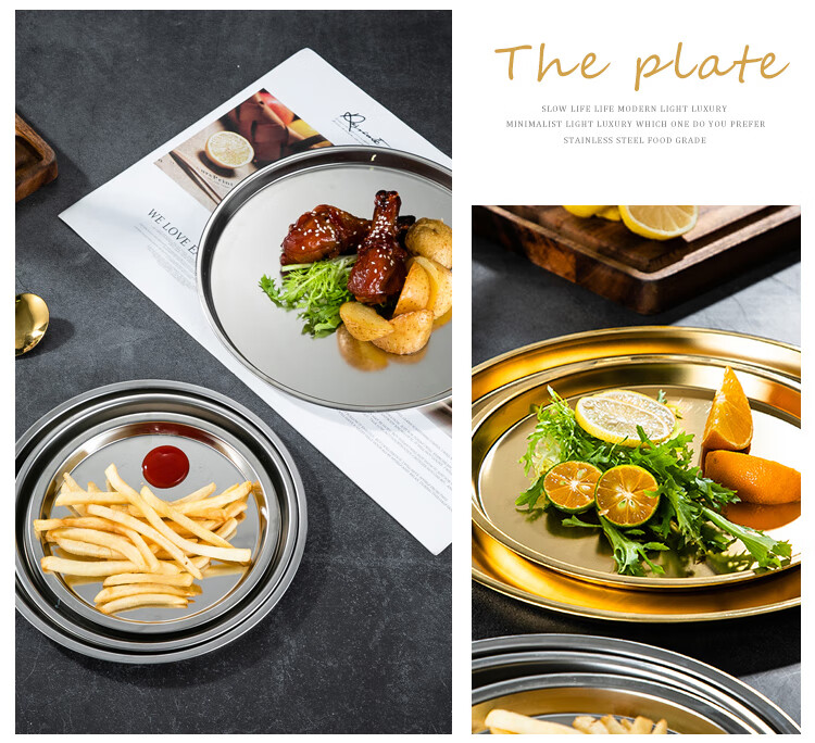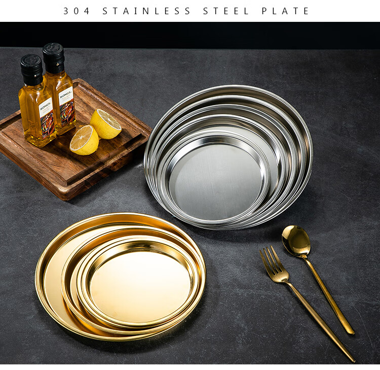 Meijia Kitchen Gang 304 stainless steel plate Home dining plate Nordic ins style Western plate steak plate tray flat bottom dessert plate 18cm silver flat bottom round plate-304 steel-