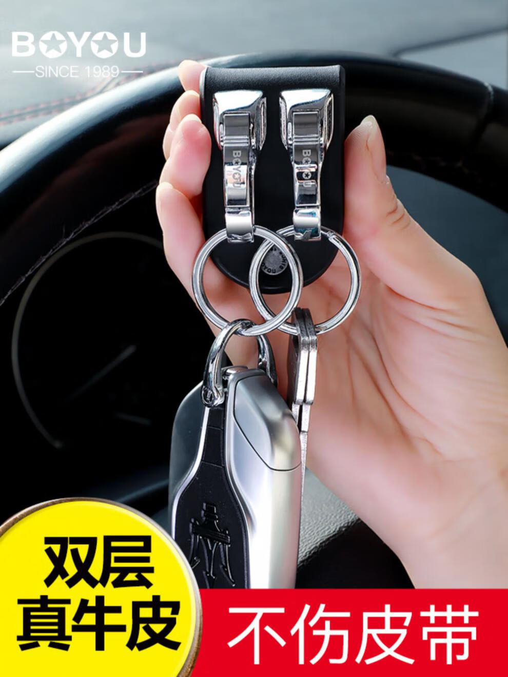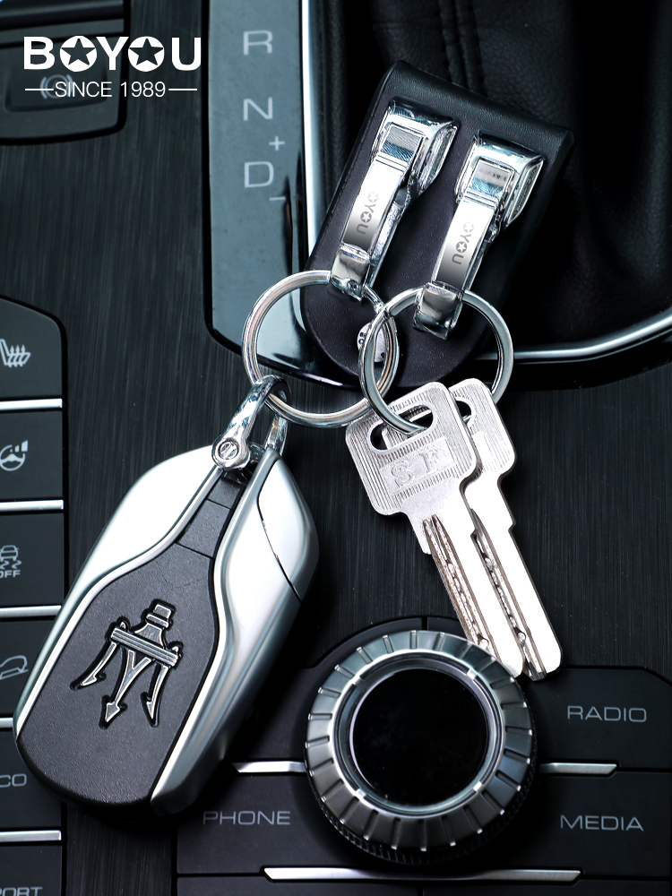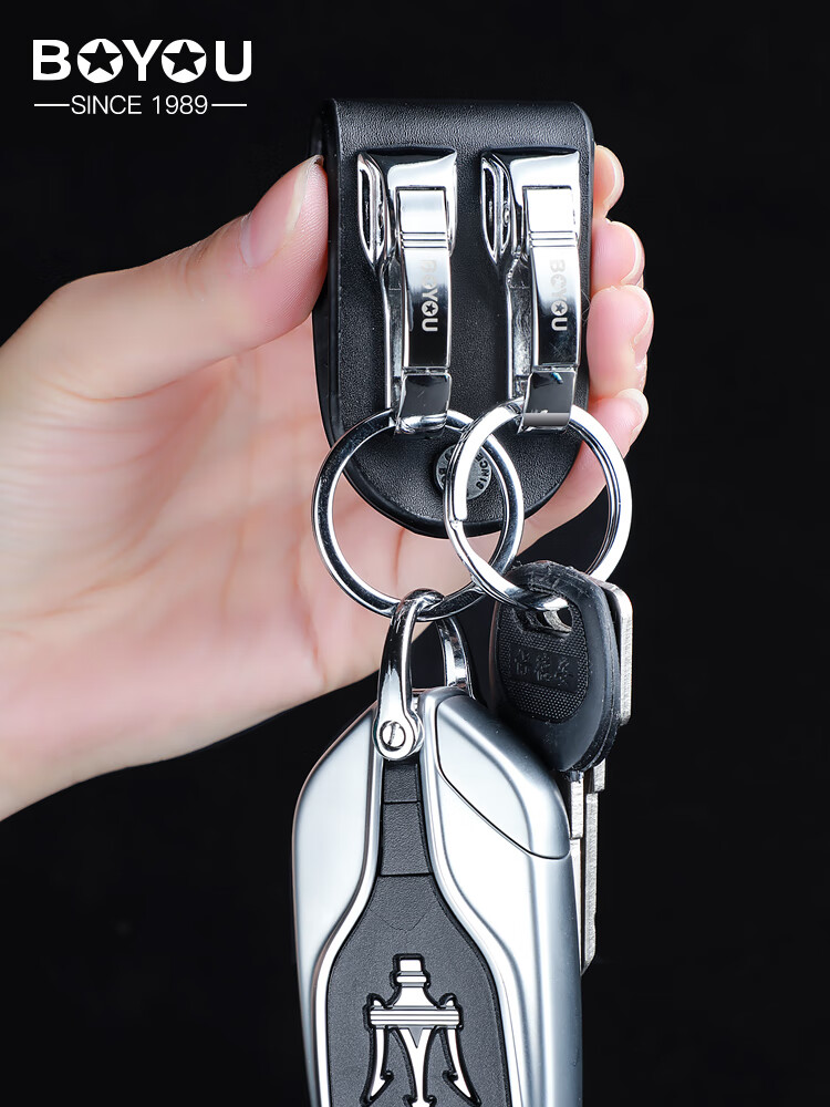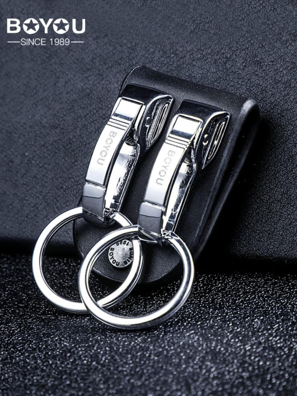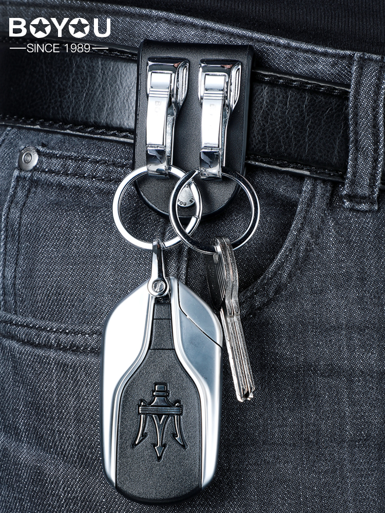 Boyou genuine leather keychain men's belt belt keychain pendant waist-mounted car hook double ring simple creative personality classic domestic product laser engraving gift new model B1251-1 genuine leather black, free small gift