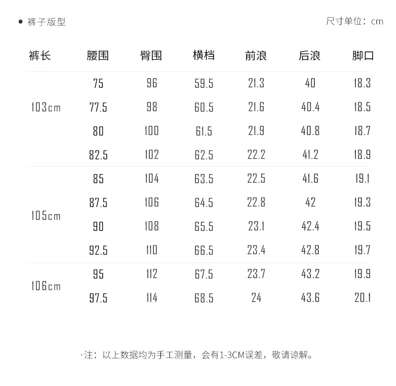Outseam (cm) 99 cm 101.5 cm 104 cm 106.5 cm 109 cm