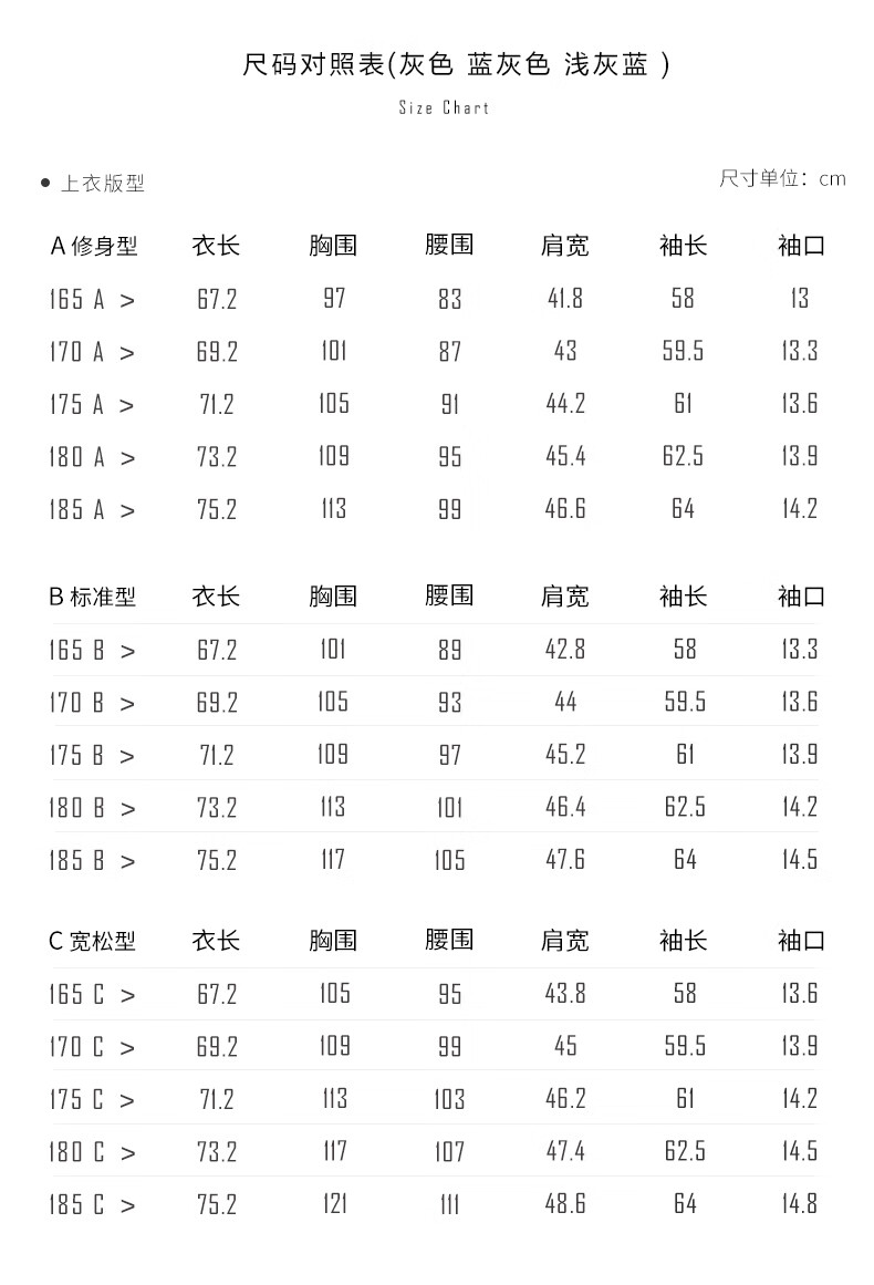 China (cm) 160-165/84-86 165-170 / 88-90 167-172 / 92-96 168-173 / 98-102 170-176 / 106-110